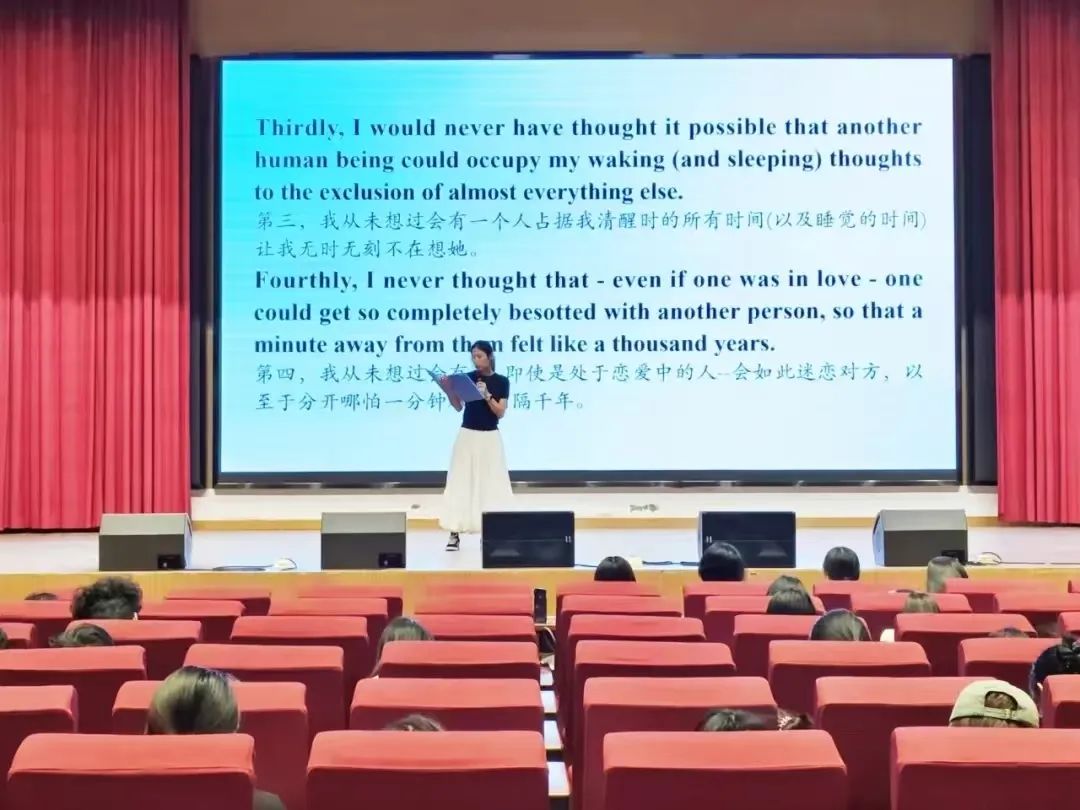 现场气氛热烈,选手们依次登台,以饱满的情感和精湛的朗诵技巧,将经典文学作品演绎得淋漓尽致。他们或慷慨激昂,或深情款款,通过清晰的发音、恰当的节奏和丰富的肢体语言,生动展现了文学作品的魅力,每位选手都全心投入,为观众带来了一场视听盛宴。比赛结束后,任守敬老师做总结发言,从语言表达、情感传递、舞台表现等方面对选手进行了细致点评,既肯定了他们的出色表现,也提出了专业的改进建议。经过公正评审,最终英语234谭盼婷和英语236李佳玥同学荣获一等奖;翻译232班裴乐怡等九位同学获得二等奖;英语231班王改男等十四位同学获得三等奖。此次比赛为校园文化增添了浓厚的艺术氛围。