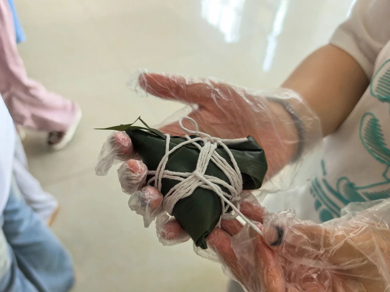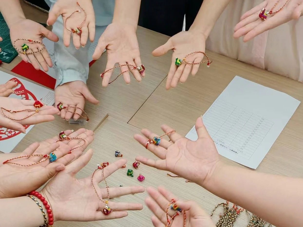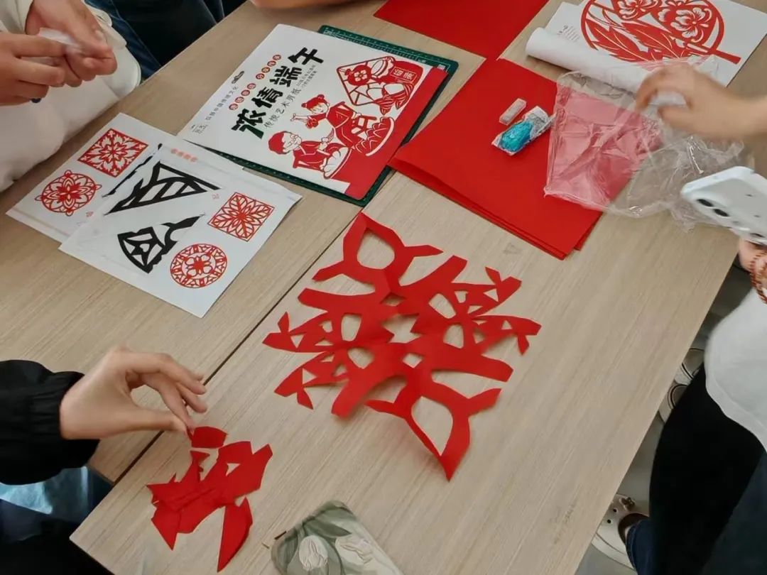 活动现场精心设置剪纸、五彩手链编制、包粽三大特色体验区。在剪纸艺术区,师生们执剪创作,将端午龙舟竞渡、艾草菖蒲等传统元素与现代创意巧妙融合,随着剪刀在红纸上灵活游走,一幅幅精美的剪纸作品跃然眼前,让非遗魅力在镂空的纸间尽情绽放。在五彩手链区里,各色丝线在指尖翻飞穿梭,参与者们互帮互助,运用平结、金刚结等传统绳结编法,精心制作出寓意平安吉祥的端午手绳。包粽区更是粽香四溢、热闹非凡,师生们娴熟地用翠绿粽叶包裹雪白糯米,填入红豆沙、红枣等香甜馅料,在欢声笑语中包出一个个棱角分明、饱满紧实的粽子。