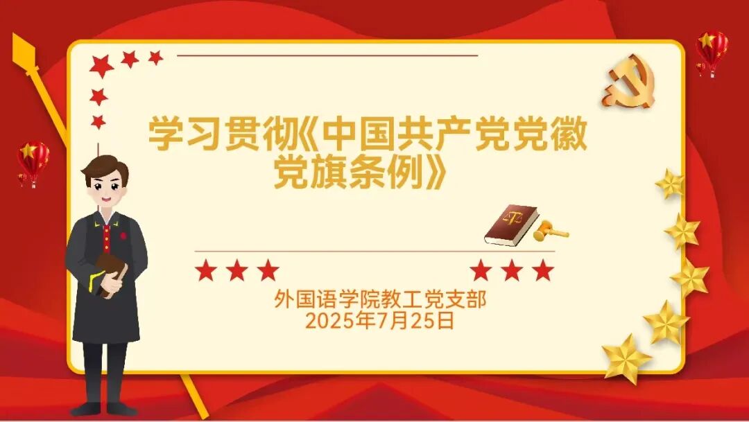 为进一步强化党员政治意识,深刻认识党徽党旗对于党的形象和尊严的重要意义,2025年7月25日,外国语学院教工党支部以线上形式开展了以学习贯彻《中国共产党党徽党旗条例》为核心的主题党日活动。
