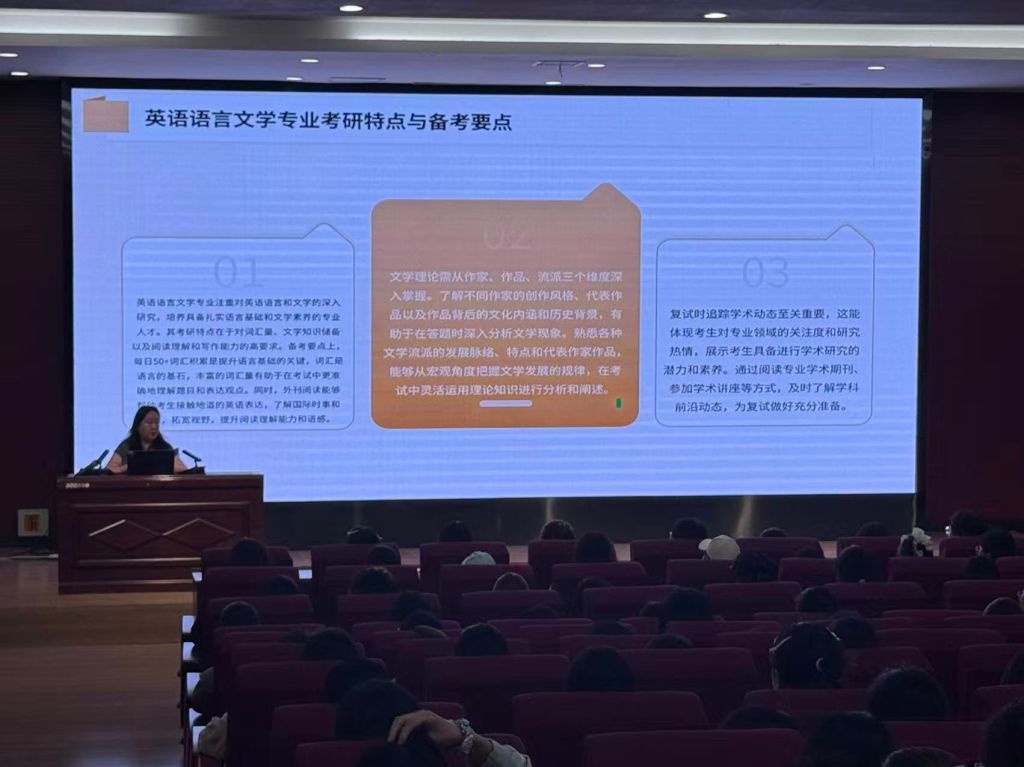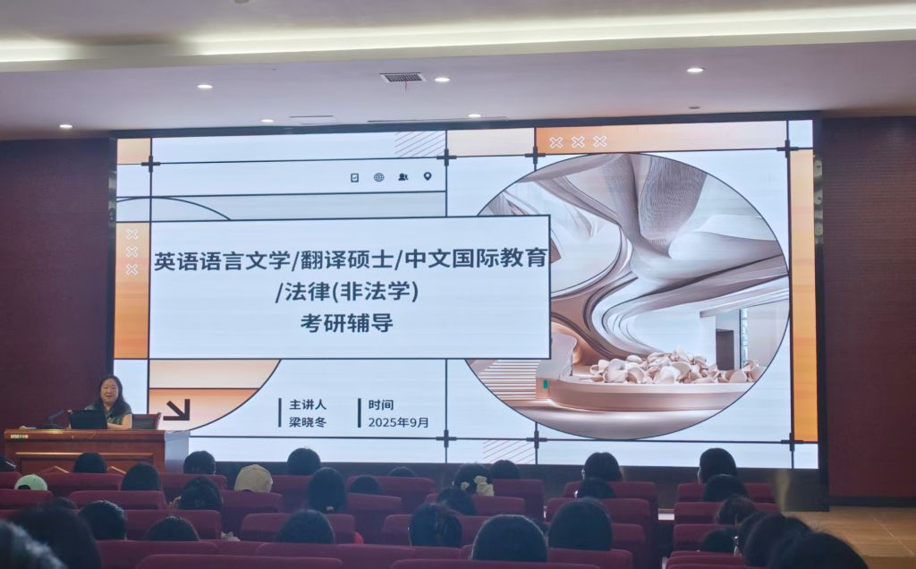 2025年9月8日下午五点,学院楼报告厅,一场涵盖英语语言文学、翻译硕士、中文国际教育、法律(非法学)等专业的考研辅导讲座在学校报告厅成功举办。讲座由梁晓冬院长主讲,吸引了众多有考研意向的学子到场聆听,为他们的考研备考之路提供了专业且实用的指导。