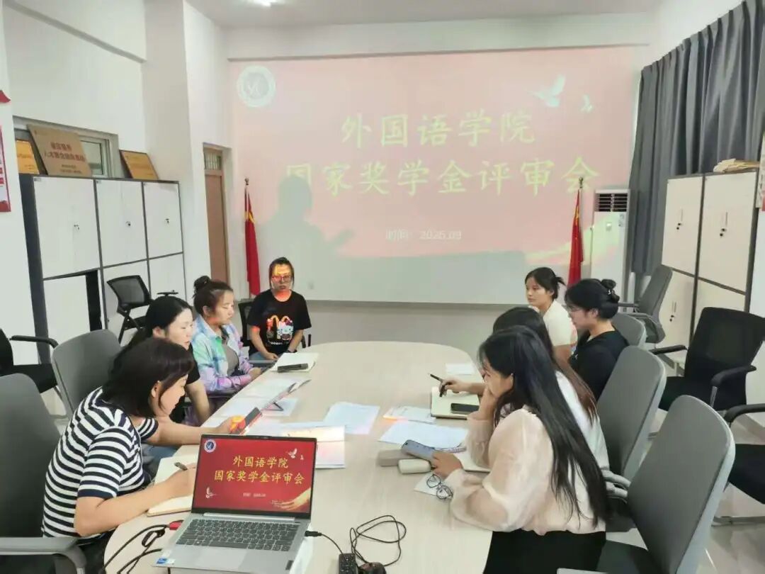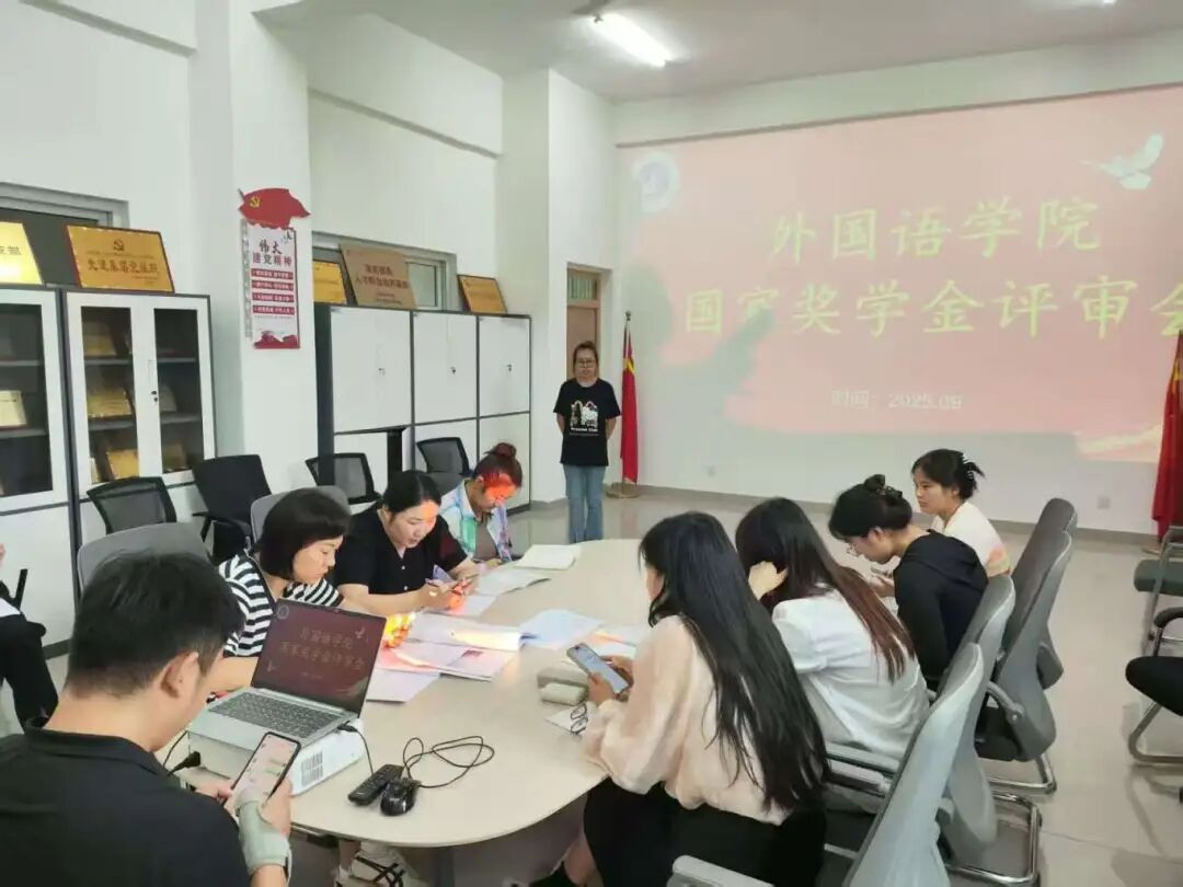 9月15日下午三点,外国语学院于教学楼2-402会议室组织召开国家奖学金评审会,确定拟推荐人选。外国语学院党委副书记王伟、团委书记温雪燕、资助专管员张智深、全体辅导员及候选人参加。