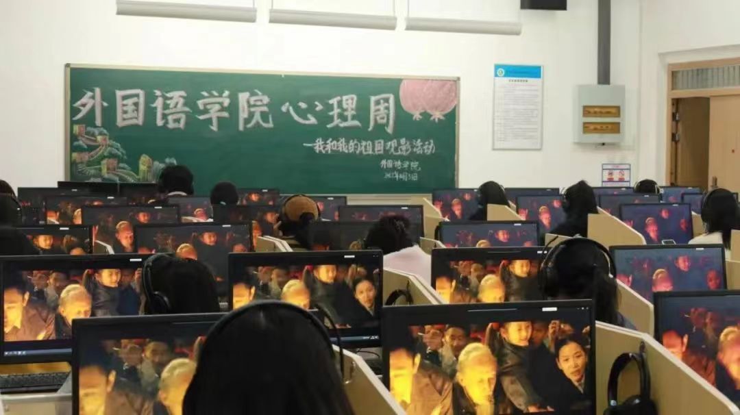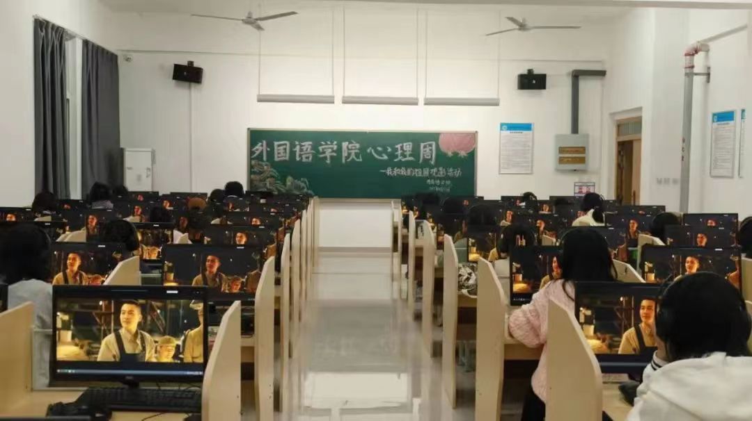 为贯彻党的二十大精神,高举中国特色社会主义旗帜,弘扬伟大的爱国主义精神,宣传心理健康知识,丰富学生的课余文化生活,营造健康文明的校园文化氛围,外国语学院于10月31日-11月1日在教学楼2语音室开展“喜迎二十大,健康‘心’征程”主题观影活动,2022级全体同学共同观看《我和我的祖国》。