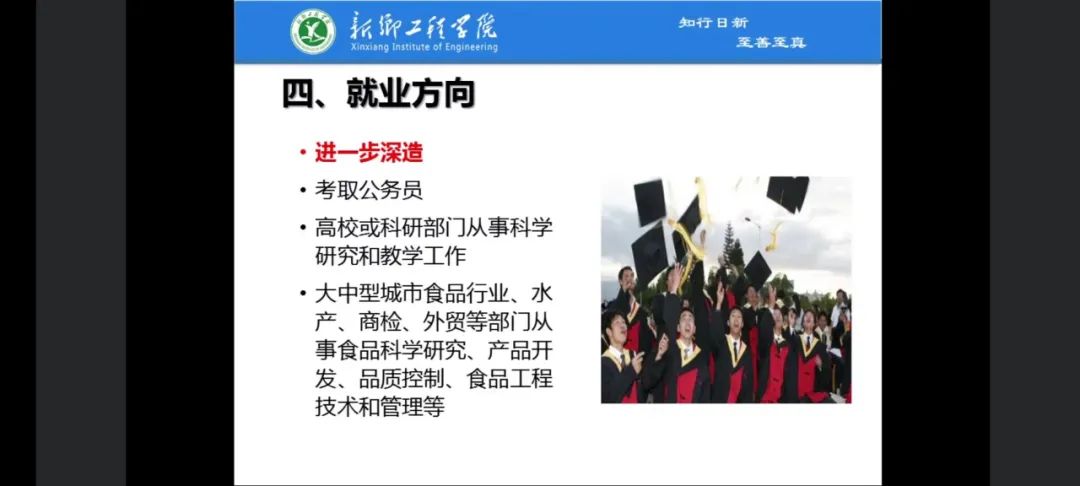食品教研室副主任苏玖玲以及赵宁宁老师分别就食工专业和食质专业的学习课程、培养目标与要求、本科必备能力等方面进行了详细的介绍,充分了解同学们对专业的认识情况后,又从专业角度详细讲解了食工、食质专业未来的就业路线,并希望同学们用心学好专业知识,明确自己的学习目标。