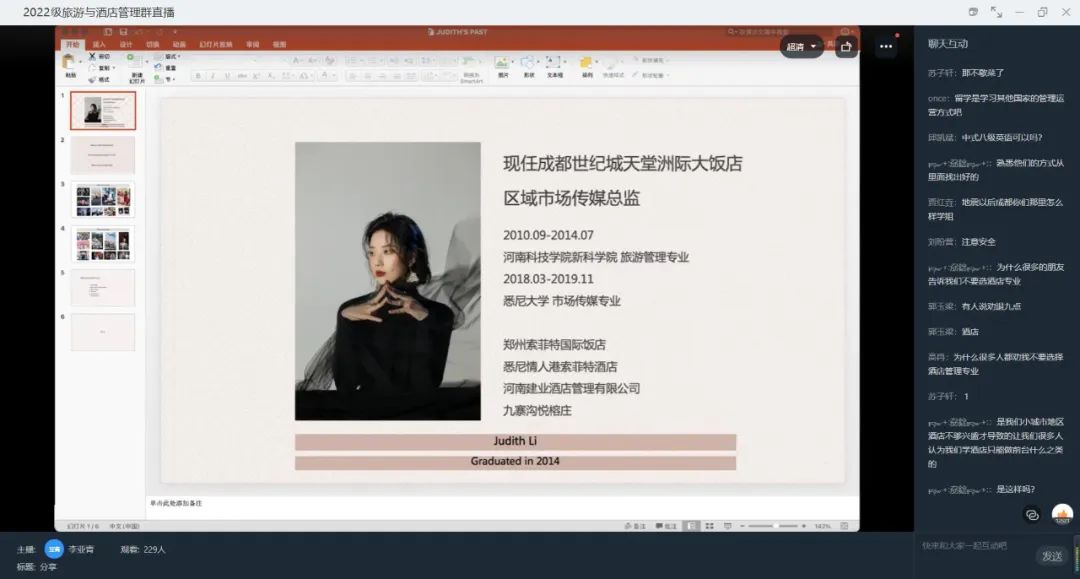 9月7日下午由我院优秀校友李亚青就旅游酒店专业作报告,李亚青向同学们介绍了个人从永利23411集团官网毕业到悉尼大学读研究生的发展历程,工作岗位从最初的大堂吧到西餐厅到总机再到市场传媒部,她以自己的亲身经历告诉大家无论在哪个部门,只要有端正的学习态度,就可以发光发热。随后李亚青向同学们介绍了酒店的未来发展、酒店基本的运营部门和职能部门人力培养体系,她建议同学们提前做好职业规划、认真学习专业知识的同时也要注重实践能力的培养,为以后的就业打下坚实的基础。