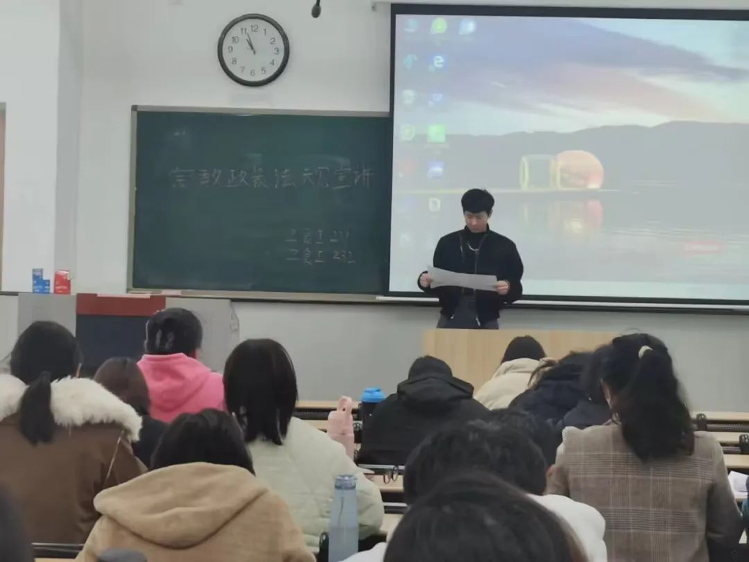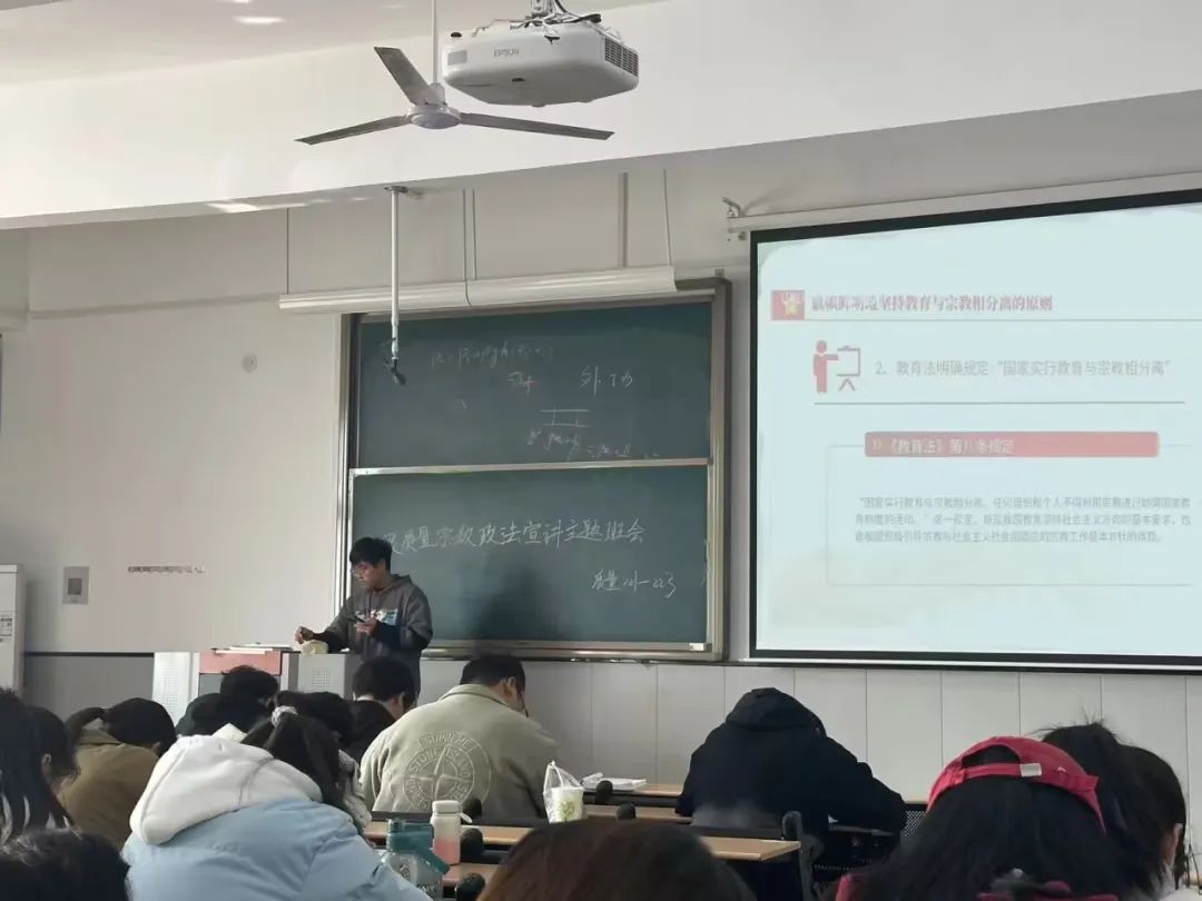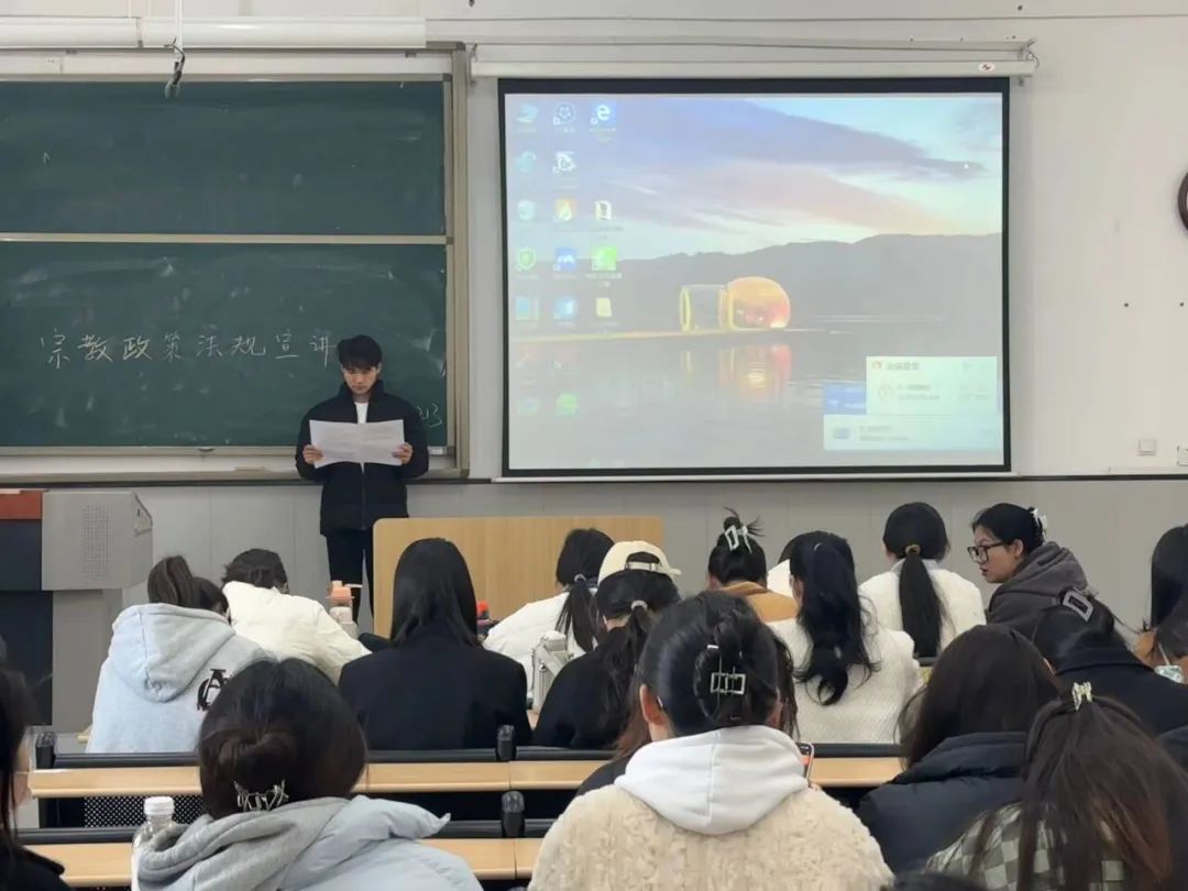 会议伊始,各班团支书围绕我国的宗教政策法规,分别从宗教政策、法律法规、宗教知识等方面进行了深入讲解,详细阐述了其基本原则和主要内容,包括宗教活动的注意事项,以及学生如何正确对待宗教信仰等问题。强调了学生们在宗教信仰活动中应当遵守的相关法律法规,使学生们对我国宗教政策法规有了更加全面、深入的认识。