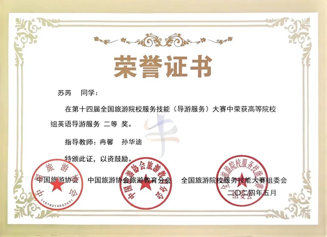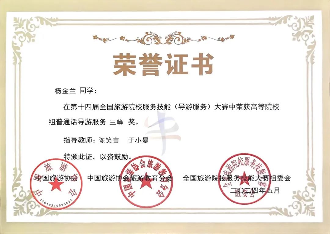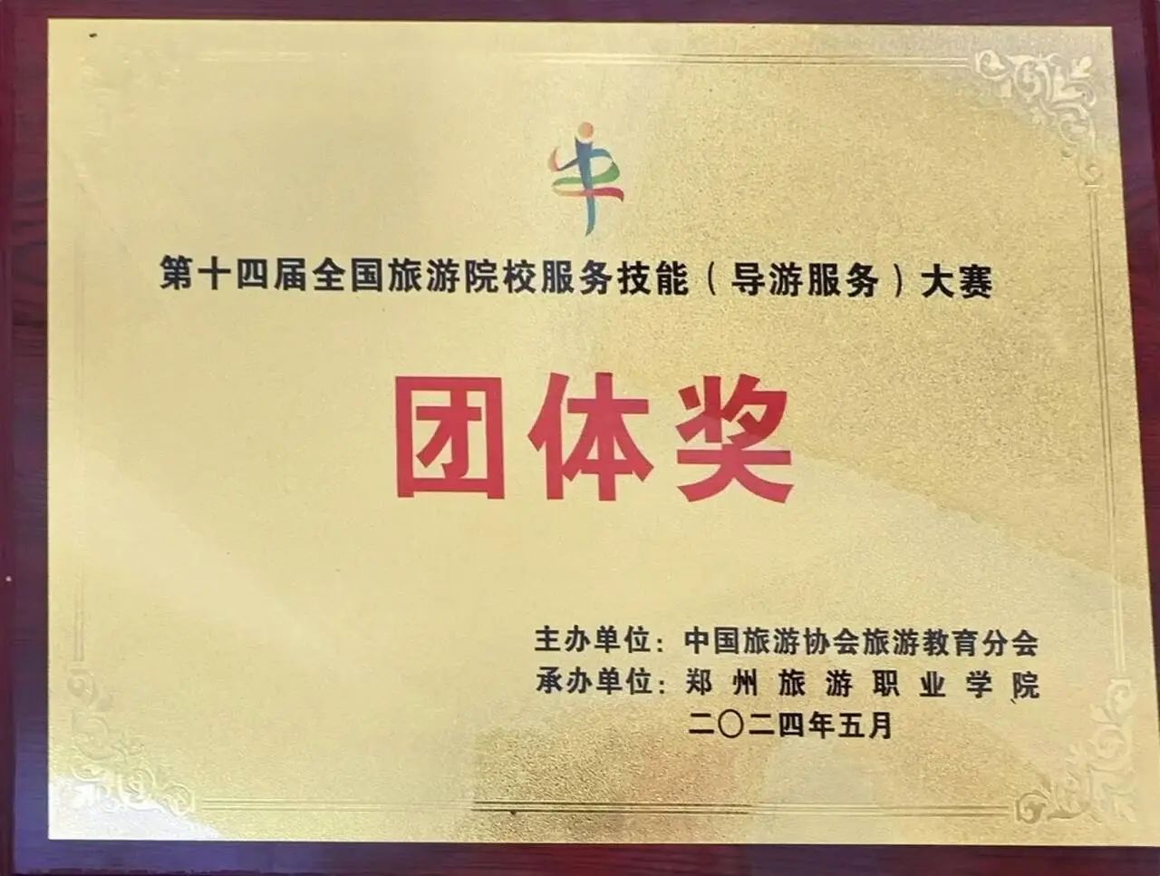 5月23日至26日,由文化和旅游部市场管理司、中国旅游协会指导,中国旅游协会旅游教育分会主办,郑州旅游职业学院承办的第十四届全国旅游院校服务技能(导游服务)大赛在郑州举行,我院孟子龙、杨金兰、张雨婷、苏芮4位同学发挥出色,取得佳绩。其中,孟子龙同学荣获高等院校组普通话导游服务一等奖,杨金兰同学荣获高等院校组普通话导游服务三等奖,张雨婷、苏芮两位同学荣获高等院校组英语导游服务二等奖。同时,我院代表队荣获团体奖,创我院自参赛以来的最好成绩。