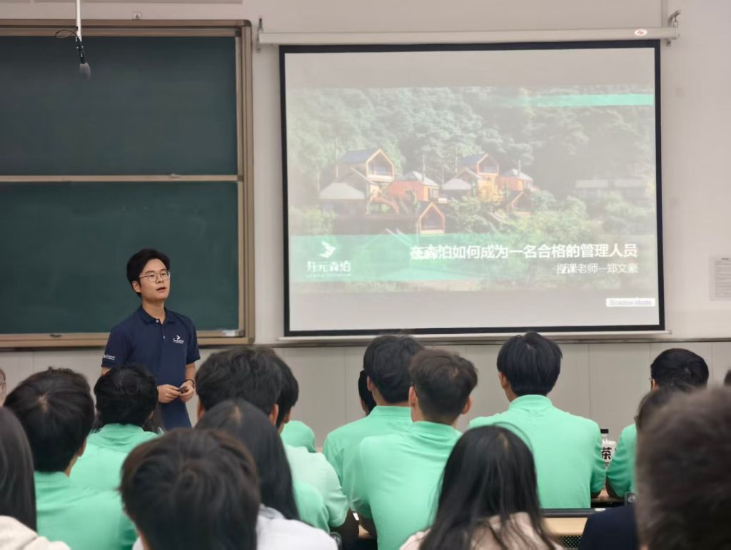 讲座介绍了开元森泊的组织管理逻辑,包括从学校到企业的转变适应、企业组织架构及其管理作用,帮助学生理解真实职场的基本运行机制,并重点阐述了管理者的定位与认知,指出中高层管理人员尤需具备卓越的服务领导力、前沿的行业认知与系统思维、以及高度的战略决策与组织赋能水平,以引领团队适应复杂多变的市场环境,驱动创新与可持续发展。在人才培养方面,讲座详细说明了开元森泊“新森代”管理培训生计划及人才发展项目,明确了从实习生、储备领班、主管到中层管理者的多路径发展体系,为同学们勾勒出清晰的职业发展蓝图。