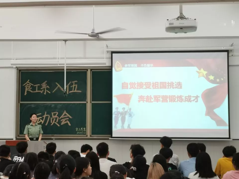 为了进一步贯彻国家征兵政策,鼓励同学们积极响应国家征兵号召,积极参军入伍。食工系于5月21日17: 00在教学楼1-211开展征兵动员会,本次动员会特邀营销201班王聪、营销201班王倩文、机制204班亢向前、电气194班李震和食工172班王恒五位优秀退伍士兵分享入伍经历。参与本次会议的有20级辅导员赵丽辉老师和20级全体学生。 首先,赵丽辉老师向同学们阐述了动员会的意义,同时介绍了五位优秀退伍士兵的基本情况。接着,五位优秀退伍士兵依次上台讲话,王聪同学分享了他为时五年的入伍经历,尽管训练艰苦、环境恶劣,但是他坚持到最后,并以优异的表现在部队获得"优秀士兵”荣誉称号和戍边卫国金质纪念章等。王倩文同学讲述了自己的军旅生活,为大家梳理了入伍的必备流程和必备条件等方面,并鼓励大家进入军营丰富自己的人生阅历。随后,亢向前同学和李震同学分享了他们在军营中学到的打枪、开坦克、射箭等专业知识,向同学们讲解了大学生入伍的未来发展规划,以及国家为鼓励大学生入伍所推出的一系列优惠政策。最后,王恒学长总结了前几位同学的发言,作为退伍后考研成功的士兵,他激励同学们努力学习,并希望同学们积极响应祖国号召,踊跃参军报国。 此次入伍动员大会的成功召开,使同学们对应征入伍的优惠政策有了全面的了解,对参军入伍有了新的认识,同时激发了同学们应征入伍、报效祖国的热情。