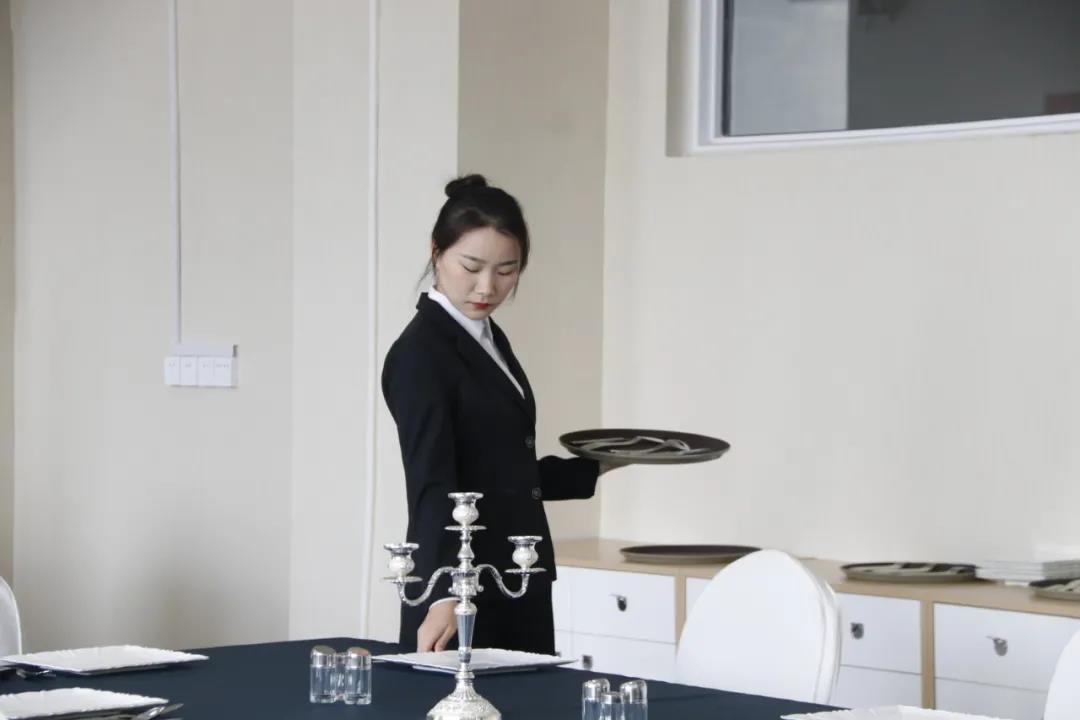 考核开始,陈老师介绍此次课程考核的分组及评分标准,希望同学们认真对待此次考核。同学们依次完成考核内容,从铺台布、拉椅定位到摆放餐具、折叠盘花一气呵成,动作优雅、过程流畅,展现了酒店人的专业技能风采。陈老师对学生们精彩的表现和努力给予肯定,并就本次西餐摆台实训考核进行总结,指出考核中学生们存在的问题,为学生们指点迷津。