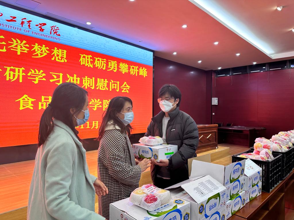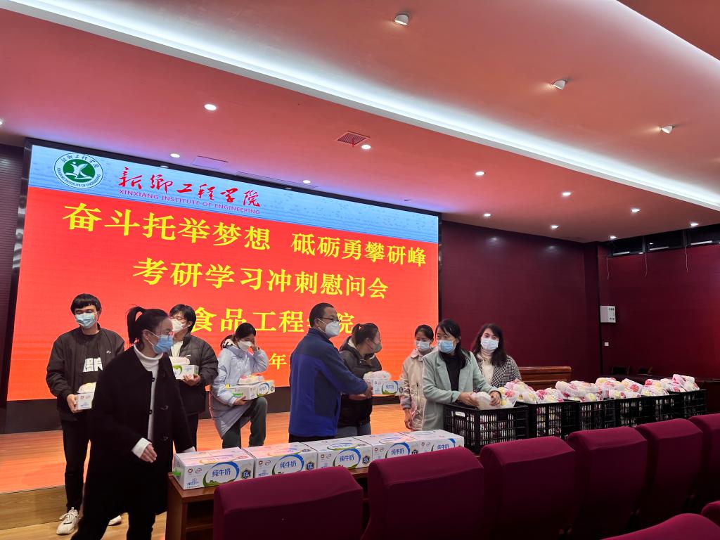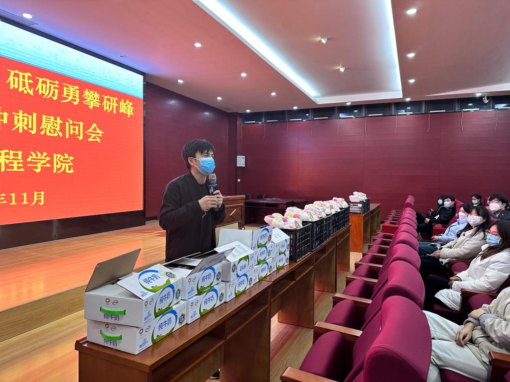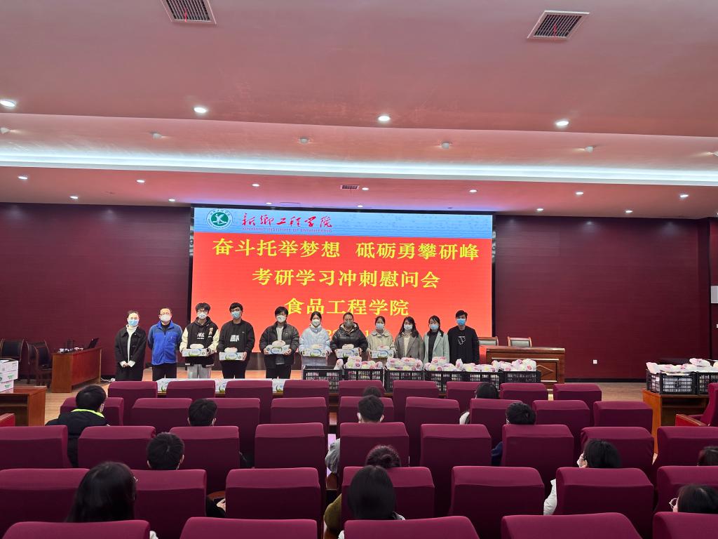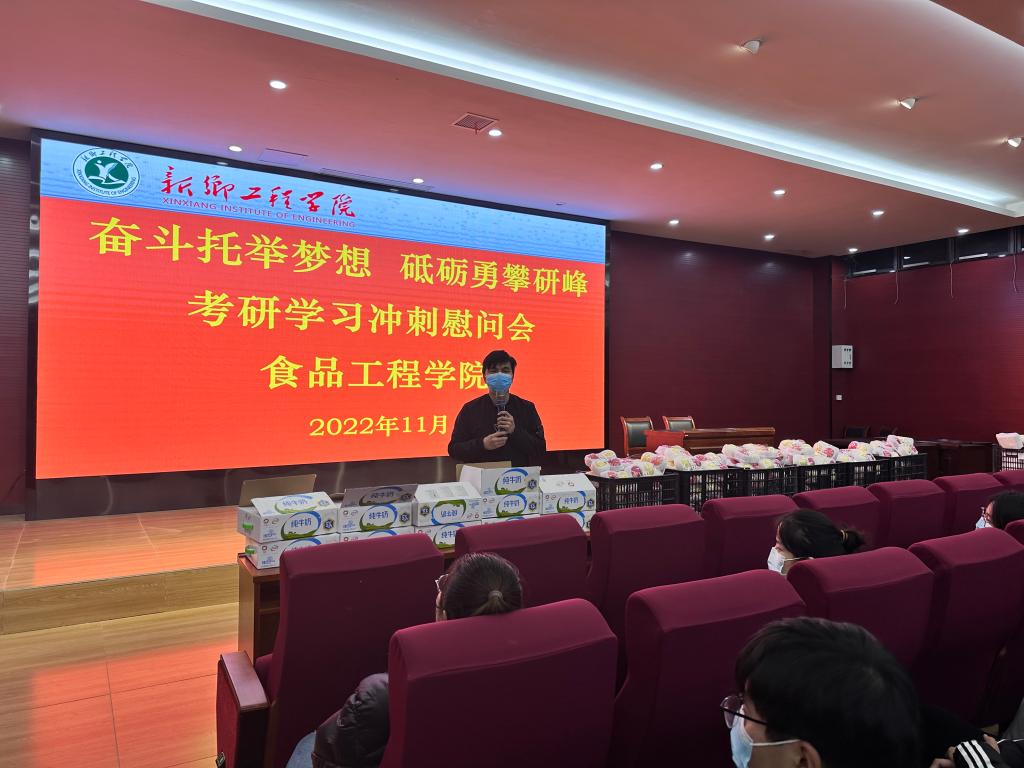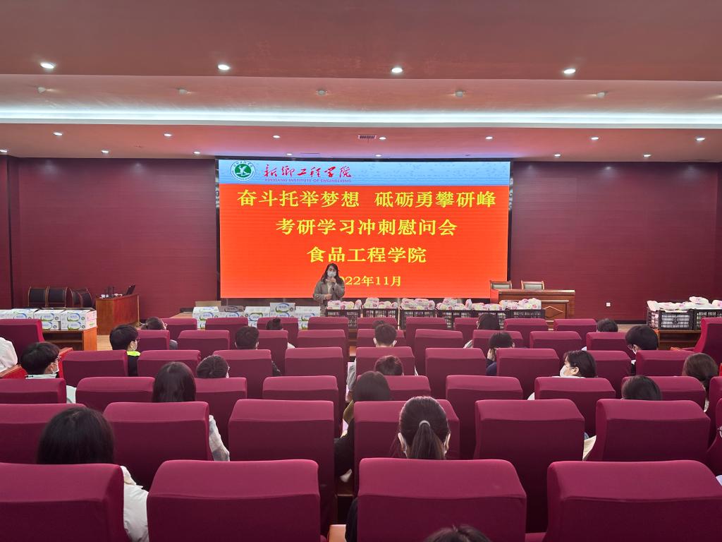 为鼓舞考研学生士气,增强考研信心,舒缓备考压力。食品工程学院于11月4日晚上7:30在学院楼报告厅开展考研学习冲刺慰问会。副院长孙华迪、副书记张晓娜、团总支书记朱国政、辅导员刘双华、杨淑云、赵曼及食品工程学院全体考研学生参加此次会议。