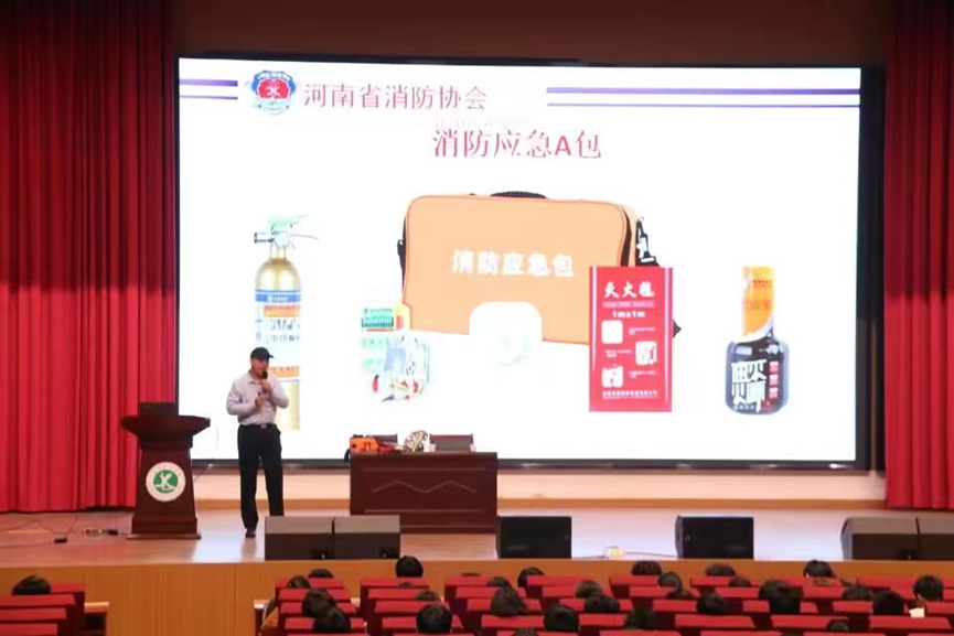 在之后学生们的消防安全讲座中,冯宗力教官引用身边的真实案例,播放了震撼人心的火灾现场视频与相关新闻,视频中的惨状为我们每个人都敲响了警钟,也让同学们切实地感受到了水火无情的可怕。接着,冯教员强调火灾事故中烟雾的危害,用真实的烟雾案例进一步加深了火灾烟雾的杀伤力,并向同学们介绍了“湿毛巾防烟法”和“专业防烟法”两种防烟方法,并亲自示范防烟防毒面罩的佩戴方法。最后,冯教员用视频向同学们介绍了消防应急A包的使用和新型灭火器—水基SD灭火器的优良性能及使用方法,再次强调在火灾面前正确的逃生自救措施,并深情的向同学们发出呼吁,现代消防知识三要素,消防知识,消防意识和消防面具缺一不可,一定要牢记于心。整个讲座在热烈的掌声中圆满结束。