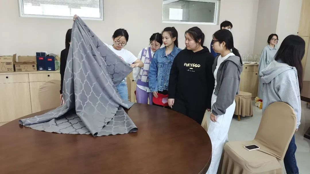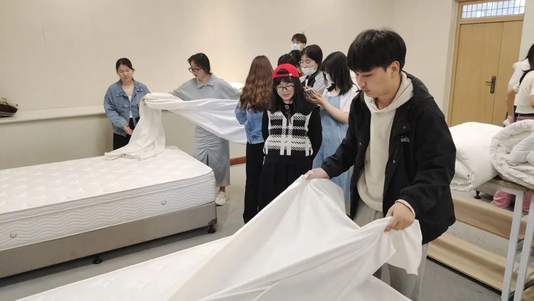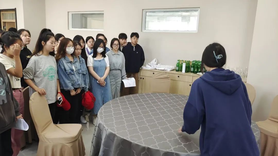27日,各小组于上午9:00在综合实验楼3楼集合,有序进行实训室参观。此次参观的实训室有客房实训室、中餐实训室、西餐实训室、茶艺实训室以及酒水实训室等5个实训室。各小组分别在客房实训室认识床品,学习简单的铺床技能;在中餐实训室参观并学习简单的铺桌布、叠餐巾等技能;在西餐实训室与学长学姐积极互动,了解并记忆基本西餐餐具,并通过抢答小游戏检验识记成果加深记忆,同时跟随学长学习西餐桌布铺设以及如何掌握托盘等实用小技巧;在茶艺实训室中,亲口品尝茶水,了解学习不同品种的茶叶的特点并进行识记;在酒水实训室中,识记不同酒水及其制作方法,观看学姐现场调制酒水并进行品尝。实训室参观大大提高了同学们对之后专业技能的学习的兴趣,意义非凡。