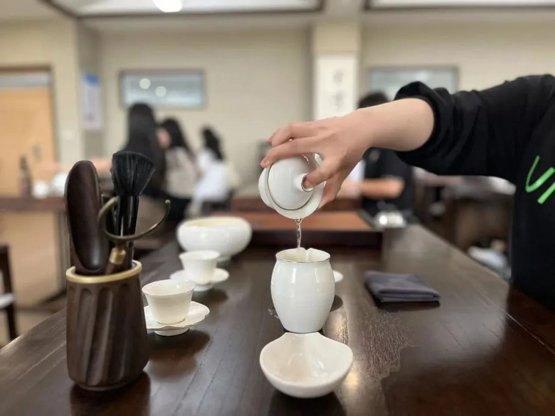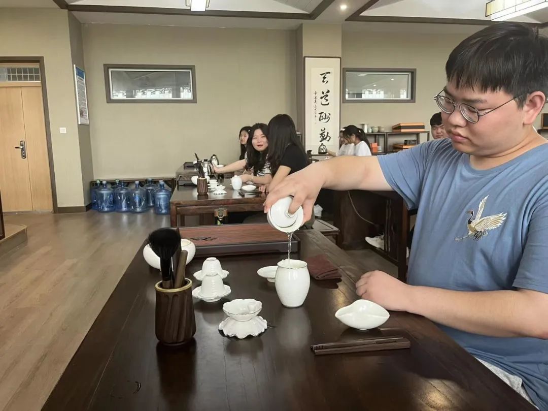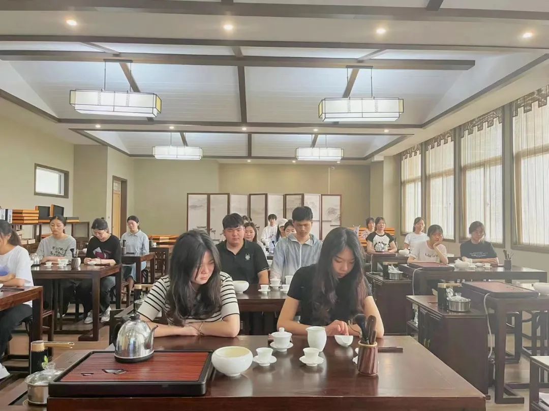 茶艺实践方面赵姗姗、冉馨、刘明宇三位老师带领同学们认识茶具茶器、六大茶类和再加工茶的制作工艺以及代表名茶,掌握不同茶叶的冲泡技巧和方法,学会布置茶席、鉴赏茶叶和功夫泡流程等。实习周期间对同学们茶席布置、仪容仪表、冲泡技艺和茶汤滋味等方面进行考核。通过实训学习同学们在理论课基础上自己动手泡茶品茶,既能将理论落地,又能陶冶自身洗涤心灵,提升其人文素养。
