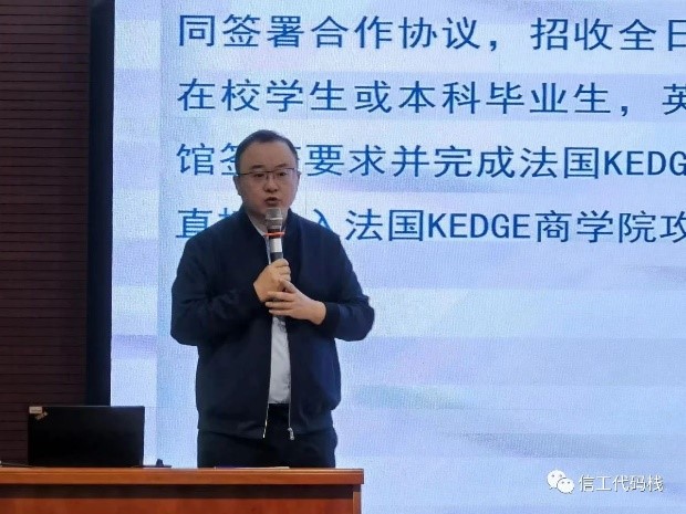 最后,他向同学们传达了自己的希望和期许,希望同学们能够积极参与新工-KEDGE 1+1国际硕士奖学金项目,锤炼自己的能力和技能,为未来的职业发展打下坚实的基础;同时期许同学们要永远保持学习热情,不断提升自身竞争力,坚持终身学习。