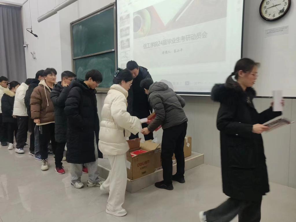 会议由秦小平院长主讲。他为同学们分析了当前的考研形势、介绍了考研的注意事项以及考试过程中应如何分配时间。他还提醒同学们考研结束不能懈怠,要积极投入到实习实践中去,用实践去检验自己的理论水平。在互动问答环节,同学们就考研相关疑虑提出交流讨论,秦小平院长都详细耐心解答。会议结束后,秦小平院长带领2020级辅导员张建、2022级专升本辅导员郭萌为信息工程学院考研学子分发考研文具。