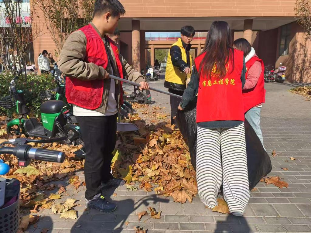 为了助力校园环境建设,同时增强学生党员的服务意识与社会责任感,12 月 3 日中午,信息工程学院学生党支部与后勤管理处携手组织了一场校园落叶清理志愿服务活动。此次活动吸引了众多学生党员踊跃参与,他们以高度的热情和奉献精神,为校园环境的优化贡献力量。