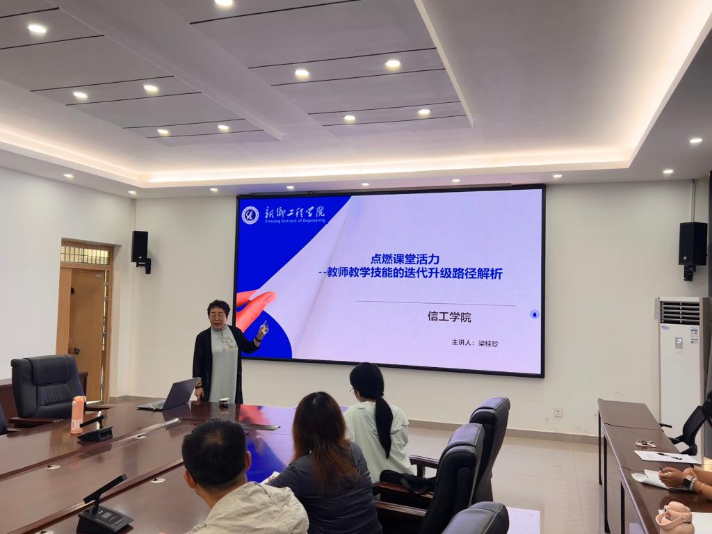 为全面提升教师教学创新能力,深化课堂教学改革,助力教师教学竞赛能力进阶,5月22日,信息工程学院组织开展了以《点燃课堂活力——教师教学技能的迭代升级路径解析》为主题的专题培训。本次培训特邀梁桂珍教授担任主讲,学院全体青年教师参与学习,共同探索新时代课堂教学技能。