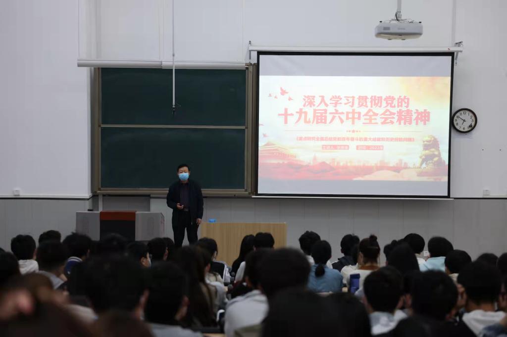 张传来副校长紧密围绕“深入学习贯彻党的十九届六中全会精神”为题,从“学习解读全面概述”、“几个数字带你学习全会公报”等五个方面展开讲授,带领同学们学习了《中共中央关于党的百年奋斗重大成就和历史经验的决议》,深刻解读了党的十九届六中全会的精神内容。讲解中国共产党在百年奋斗中领导中国人民取得的伟大成就和宝贵经验,阐述中华民族从积贫积弱到站起来、富起来再到强起来的伟大飞跃。
