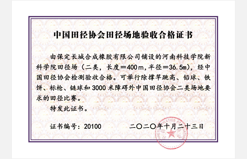 近日,中国田径协会场地器材装备委员会对我院田径场地进行验收。经专家组成员现场严格查验,认定我院新校区田径场符合中国田径协会二类场地要求,并颁发了中国田径协会田径场地验收合格证书。根据中国田径协会国家二类场地的使用标准,我院田径场地可举行除撑杆跳高、铅球、铁饼、标枪、链球和3000米障碍以外项目的全国各级别的田径比赛。