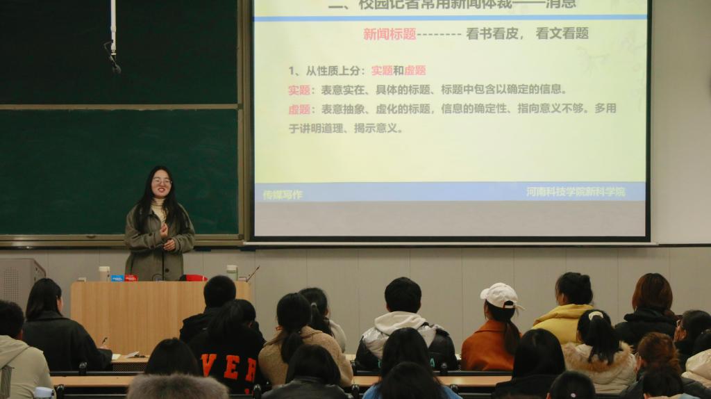 何林林老师围绕新闻采访、新闻写作两方面内容为大家做了新闻技能培训。杨利豪老师以近期我院优秀的摄影作品为例,生动形象地向大家讲解了相机的基本知识、构图方法、摄影技巧等。吴月利同学结合自己在新媒体中心的工作经验,分享了她在摄影方面的心得体会。王冰玉同学介绍了消息与通讯稿两种新闻稿体裁的写作方法。