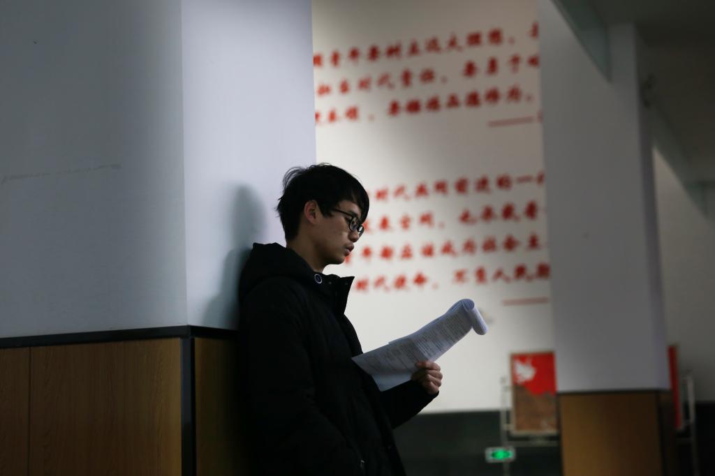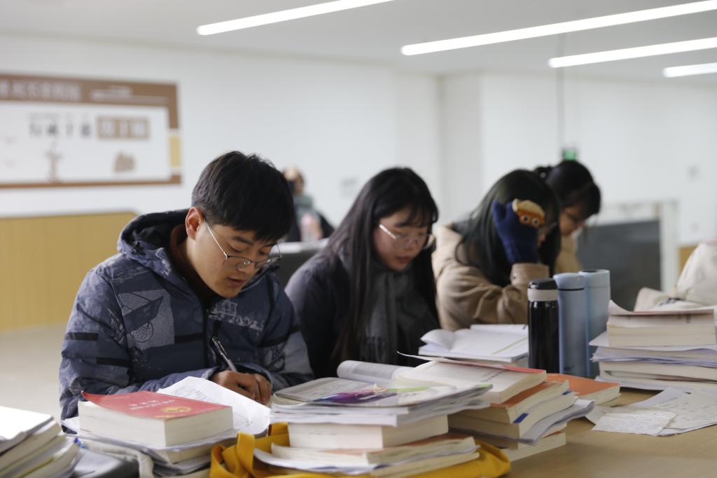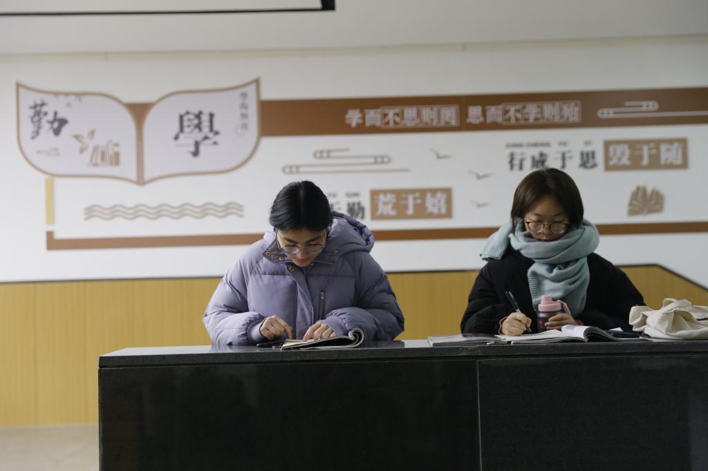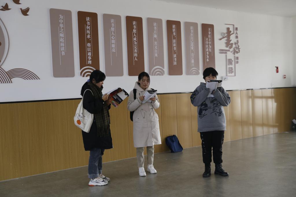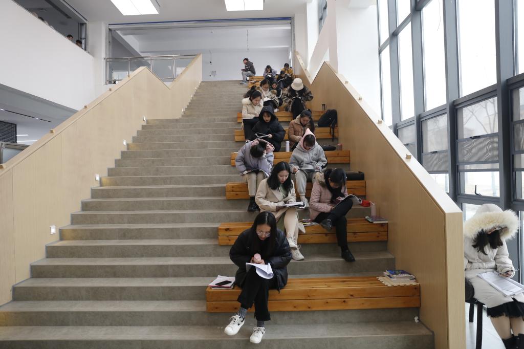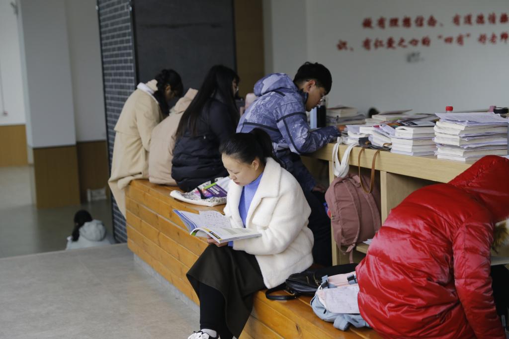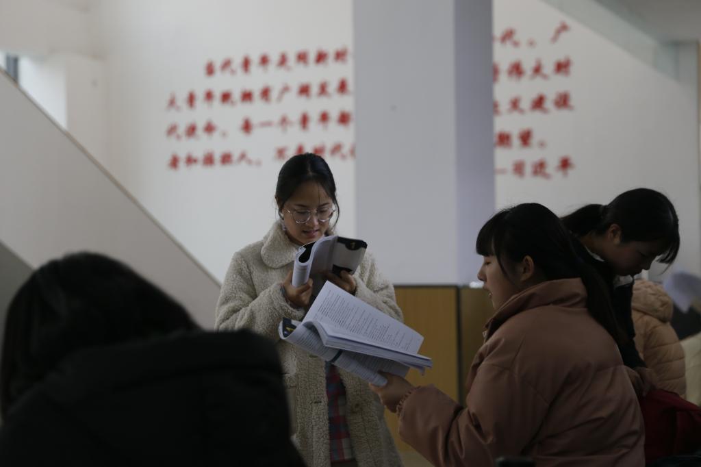 期末考试已至,学生们紧锣密鼓地复习备考,走廊、教室等处处可以看到学生们背书的繁忙身影。同学们不畏寒冷,有的拿着书本来回走动,有的坐在台阶、板凳上,专心致志、忘我学习,朗朗的背书声充满了整个校园。