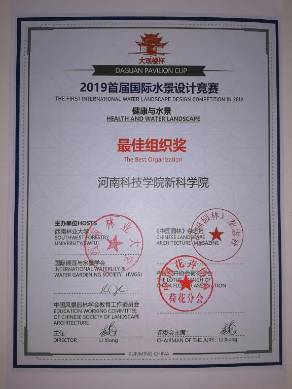 近日,2019年首届国际水景设计大赛颁奖典礼暨风景园林高峰论坛在西南林业大学举行。开赛以来,学院高度重视,精心组织,广泛宣传,积极动员广大师生踊跃参赛。最终凭借良好的组织能力和精神风貌,我院被组委会授予“最佳组织奖”荣誉称号。
