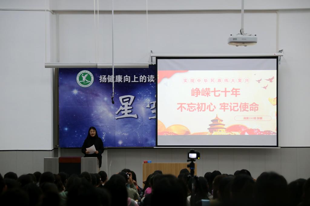 10月18日下午,由组宣部主办、外语系承办的以“峥嵘七十载,与国同梦”为主题的“星空讲堂”在新校区B2教学楼110教室举办。外语系教师代表以及2018、2019级全体学生参加此次活动。
