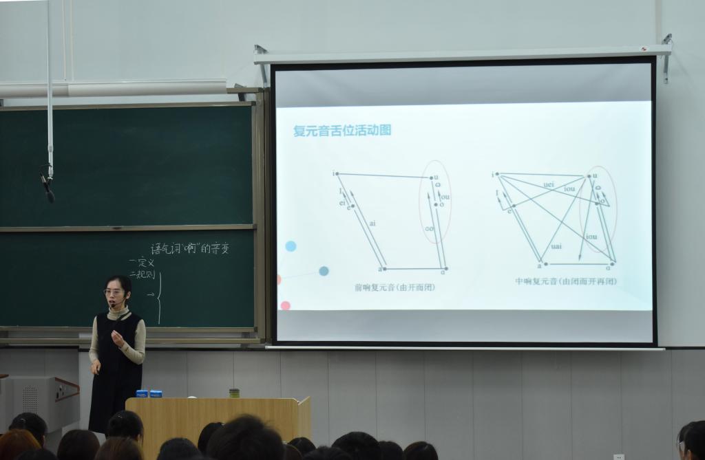 韩晓老师以《语流音变》为主题进行授课,她采用“讲解+互动”的教学方法,以小组为单位的授课方式极大地提升了学生的学习兴趣和课堂参与度。在韩晓老师授课过程中,学生积极参与课堂互动、踊跃回答问题,课堂氛围活跃。