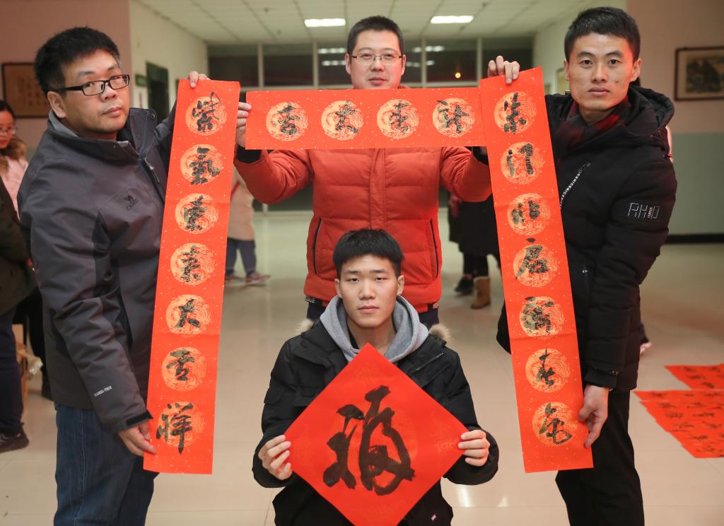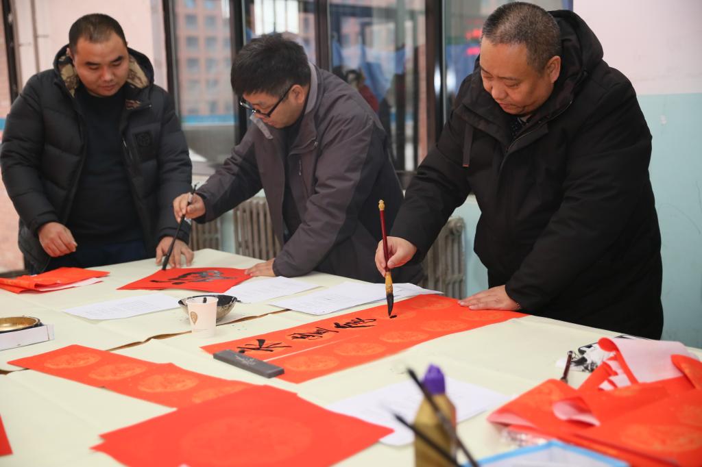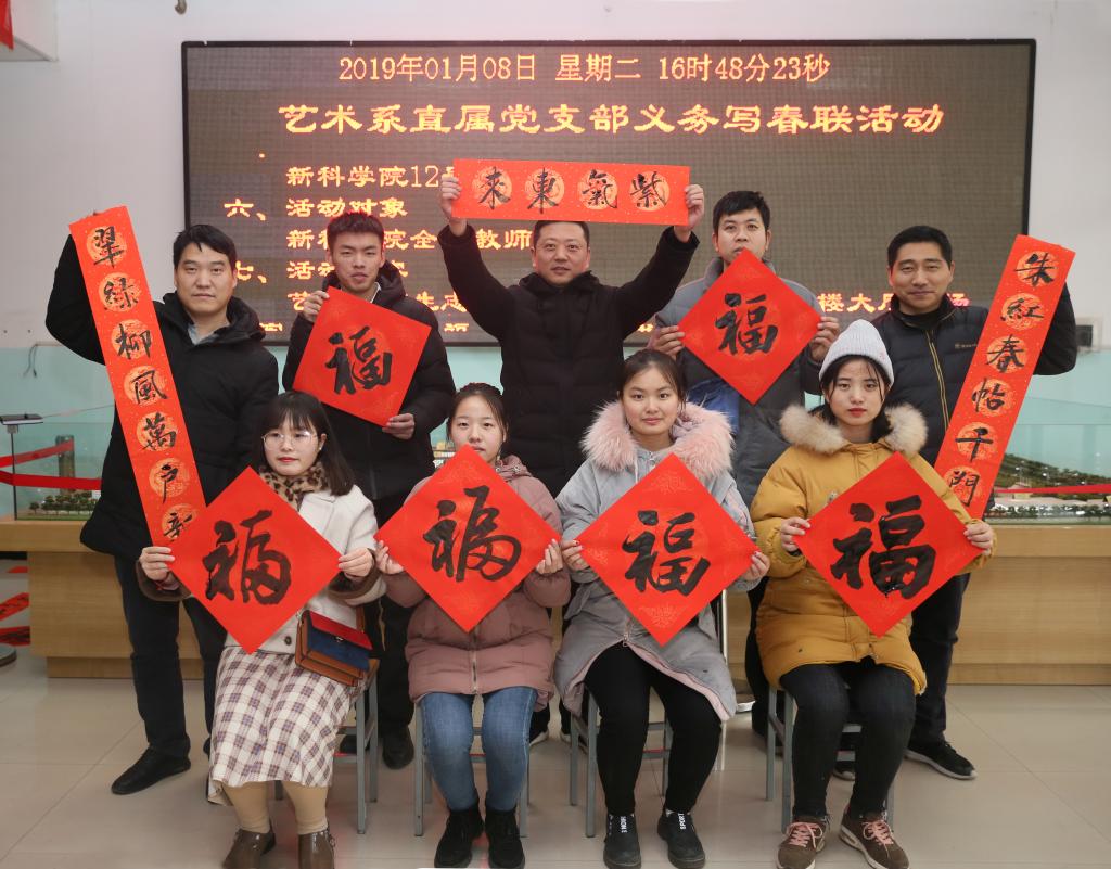 1月8日下午,在2019年春节即将到来之际,由组宣部主办、艺术系直属党支部承办的“迎新春 送吉祥”义务写春联志愿服务活动在12号教学楼1楼大厅举行。我院艺术系教师邢孟志、辛学东、张志伟现场挥毫泼墨,为在校师生员工书写新年愿望,提前送上新春祝福。
