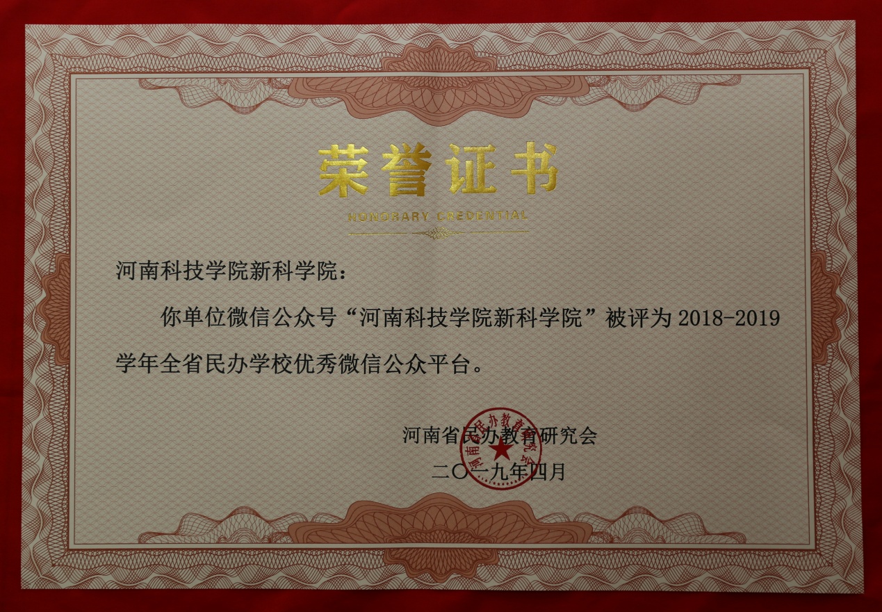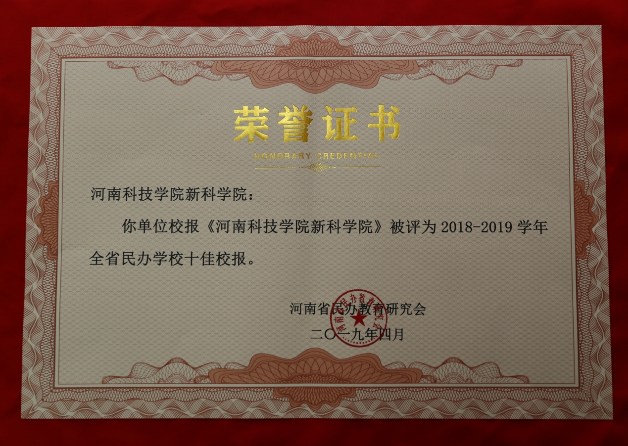 近日,全省民办学校宣传工作会议暨新闻发言人培训班在郑州举行。会上,河南省民办教育研究会公布了全省民办学校优秀校报、校刊及新媒体评选活动结果。我院院报《河南科技学院新科学院》、微信公众号“河南科技学院新科学院”分别荣获2018-2019学年“全省民办学校十佳校报”“全省民办学校优秀微信公众平台”荣誉称号。