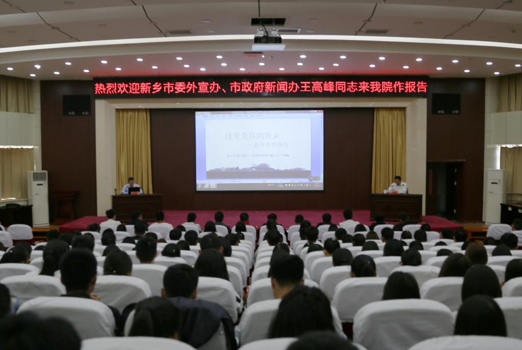 为增进大学生对新乡历史、地理、文化、发展的认识,增进大学生对市情国情党性的了解,9月26日下午3时,“新乡市情宣讲”专题报告在新行政楼308报告厅举行。新乡市委外宣办、市政府新闻办副主任王高峰同志应邀为我院师生作题为《这里是你的新乡》专题报告。我院2018级新生共同聆听了报告。报告会由组宣部长韩国立主持。