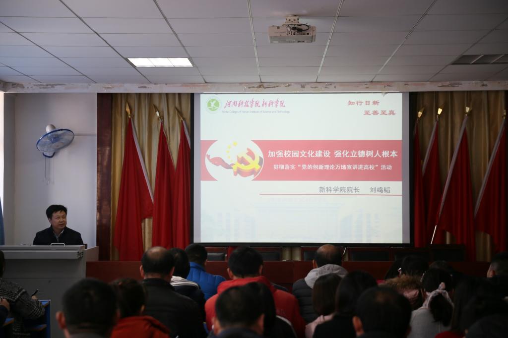 报告会上,刘鸣韬院长从“对‘文化’概念的理解”“大学职能的演进及第四职能——‘文化传承与创新’的提出”“‘文化自信’的提出及其意义”“新科学院文化建设的思考”四个层面进行详细讲解。他指出,全院师生员工要齐心协力,力争通过长期不懈的努力,让“知行日新至善至真”的校训精神,真正融入师生员工灵魂,推动校训精神内化于心、动化于行、外化于行、固化于制,成为全院师生员工共同的文化自觉和价值追求,培育“为人难为之事 尽人难尽之力”的新科风格,培养“能够明辨是非善恶、能够独立思考、具有为社会服务能力”的新科人,逐步形成具有我院独特个性的精神文化、制度文化、行为文化和环境文化,使学院成为思想道德精神高尚、学术氛围浓厚、人文底蕴深厚、校园环境幽雅的具有一定文化品位的高等院校。