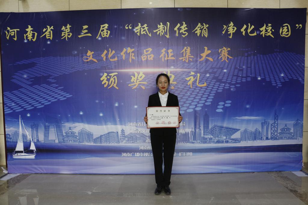 12月21日由省打传办、省工商局、省文明办、省教育厅主办的河南省第三届“抵制传销 净化校园”文化作品大赛颁奖典礼在河南财经政法大学举行。我院荣获多项荣誉,其中,经济系赵润被评为“优秀指导老师”,刘妍、代琦琦、黎培杰同学分别荣获文学类作品一等奖、三等奖、优秀奖,李扬同学荣获绘画类作品三等奖,梅卓同学荣获书法类作品优秀奖,我院荣获“优秀组织奖”。