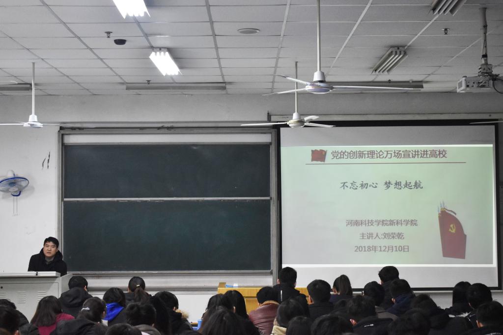为深入学习贯彻习近平新时代中国特色社会主义思想和党的十九大精神,认真落实省委高校工委、省教育厅关于开展“党的创新理论万场宣讲进高校”活动要求,12月10日中午,我院团委书记刘荣乾在12号教学楼合二教室作了题为《不忘初心,梦想起航》的宣讲报告。我院学生会、大学生宣讲团、大学生艺术团、青年志愿者联合协会全体成员聆听了报告。