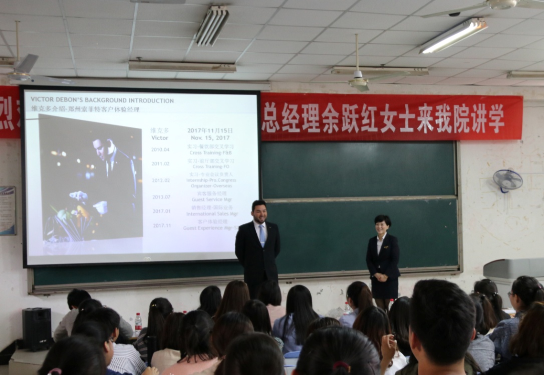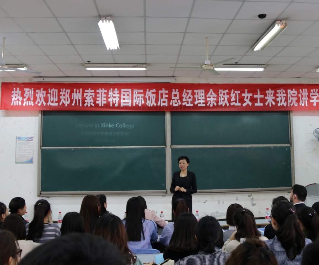 3月28日上午,郑州索菲特国际饭店总经理余跃红女士来我院访问交流并在12号楼合八教室作报告。食工系全体老师及酒店管理专业部分学生聆听了报告。