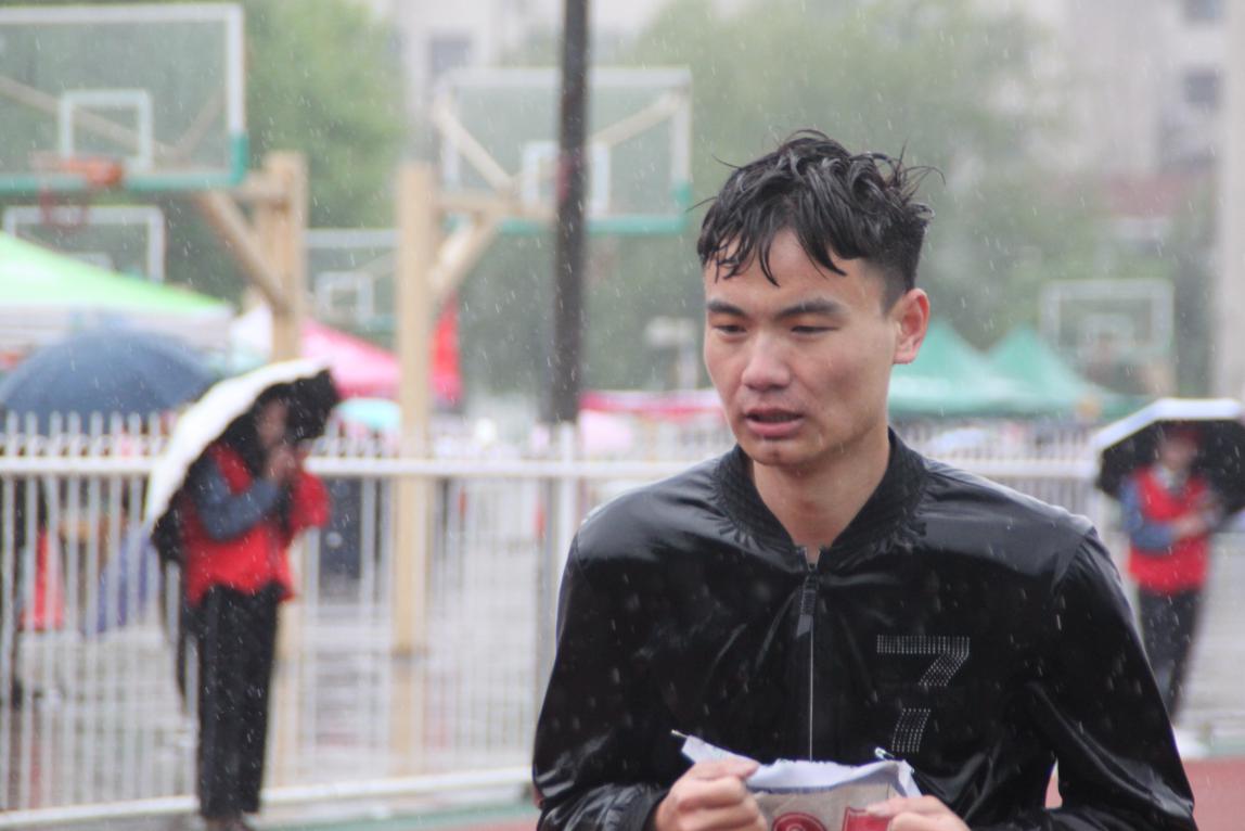 女子3000米随着骄阳西下落下帷幕,但天公不作美,13日上午的男子3000米迎来了一场淅淅沥沥的春雨,但运动员们依然坚持比赛,将青春的热血奔洒在3000米的跑道上。生工171班黄涛面对这场春雨里的比赛说到,“长跑本身就可以锻炼人们的体魄和毅力,一场小雨并不能阻挡我对比赛的热情。”在谈到第一次参加运动会就一举夺冠时,他说:“我参加比赛时心里就始终坚定一个目标,那就是拿到冠军,在比赛前我进行了刻苦的训练,能够得到此次冠军也在我的意料之中。”