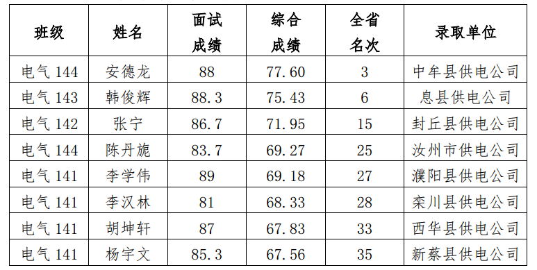 近日,国网河南省电力公司2018年高校毕业生第二批招聘(下简称国网考试)成绩已经公布,在全省电工类专业三本院校只招收35人的情况下,我院电气工程及其自动化专业共有8名同学被录取。