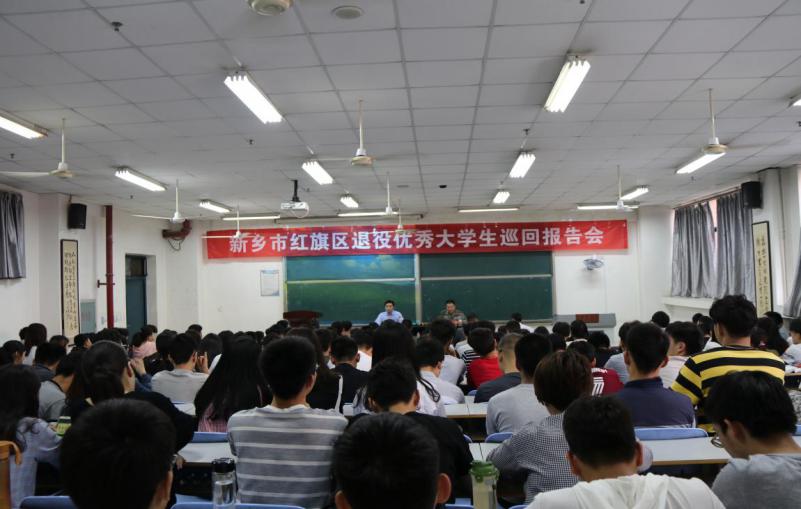 4月27日下午4时,新乡市红旗区退役优秀大学生巡回报告会在我院12号教学楼合六教室举办。我院武装部全体人员和各系学生代表200余人参加了报告会,会议由红旗区武装部部长陈爱国主持。