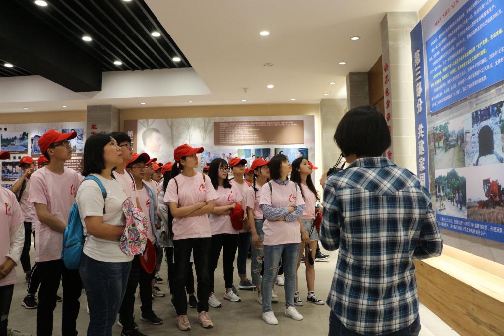 在讲解员的引领下,同学们参观了跨境电商馆、裴寨村史党建展览馆,仔细聆听了讲解员对“昔日裴寨”、“感恩奉献”、“共建家园”、“夯实根基”及“展望未来”五大部分内容的介绍,了解了裴寨由落后贫穷、生活条件艰难到今天发展劲头高涨、人民生活幸福的奋斗历程,切实体会了“听党话、跟党走、同创业、共致富”的裴寨精神,大家为裴春亮“乡亲不富誓不休”及“用感恩的心完善一切”的奋斗精神而感动。同学们观看了社区发展视频,实地参观了裴寨村旧址、裴寨水库工程、裴寨锦鲤养殖基地及蔬菜花卉基地。随后,杨汝南、闫超宇、闵旭东三位同学和裴寨社区广播站工作人员共同朗诵诗歌《中国梦,劳动美》,引发了同学们的强烈共鸣。