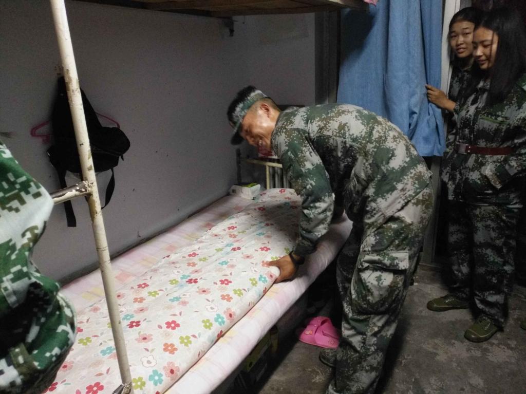 当夜幕降临,白天的军训结束,晚上还有内务检查。教官来到寝室,教大家怎样叠“豆腐被”、整理床铺、物品摆放等,在教官的示范指导下,同学们学习了一些叠被子的小技巧,内务整理的小诀窍。训练时,他们是“魔鬼教官”,不苟言笑;休息之余,他们也是朋友,和大家聊天、讲故事,在同学们的喊声中唱军歌。法学173班的刘筱涵说:“有时候站得脚麻了,还是想着要坚持下去。休息时,和旁边的同学一起讲笑话、聊天,看同学为大家才艺表演,感觉军训也不是太累。我想我以后一定会怀念这段军训时光,怀念这些人、这些事儿。”