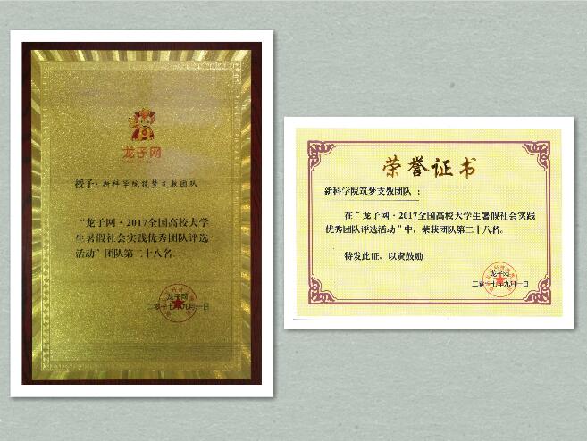 9月5日在龙子网全国暑期社会实践评选中荣获全国第二十八名优秀实践团队称号。
