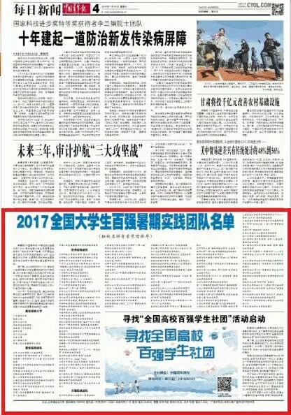 1月10日,《中国青年报》04版公布了2017全国大学生百强暑期实践团队名单,我院“传爱心火炬筑我中国梦”实践团队荣获优秀实践团队奖。