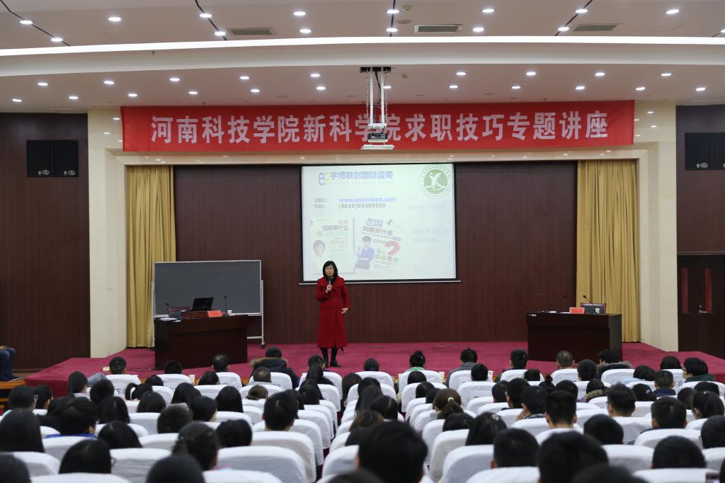 11月22日下午,由招生就业部主办、经济系承办的“河南科技学院新科学院求职技巧专题讲座”在行政楼308报告厅成功举办。本次讲座由美国威斯康辛大学硕士、新加坡国立大学学士、宇博联创国际咨询(北京)有限公司创办人林徐秀清女士主讲。我院党委副书记熊仁杰,各系主任、毕业生辅导员及学生代表280余人参加了讲座。熊仁杰副书记主持本次讲座。