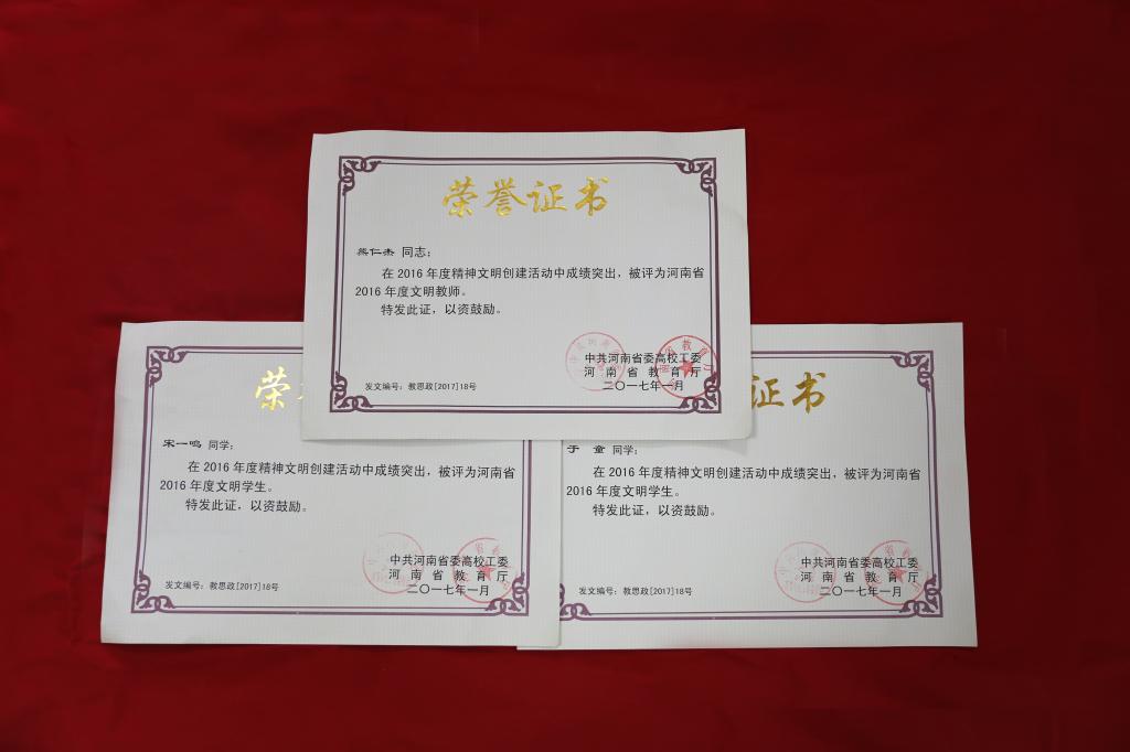 近日,中共河南省委高校工委、河南省教育厅下发《关于表彰2016年度精神文明建设先进集体和先进个人的决定》,对2016年度全省教育系统精神文明建设先进集体和先进个人进行表彰。我院教师熊仁杰获得“省文明教师”荣誉称号,于童、宋一鸣两位同学获得“省级文明学生”荣誉称号。