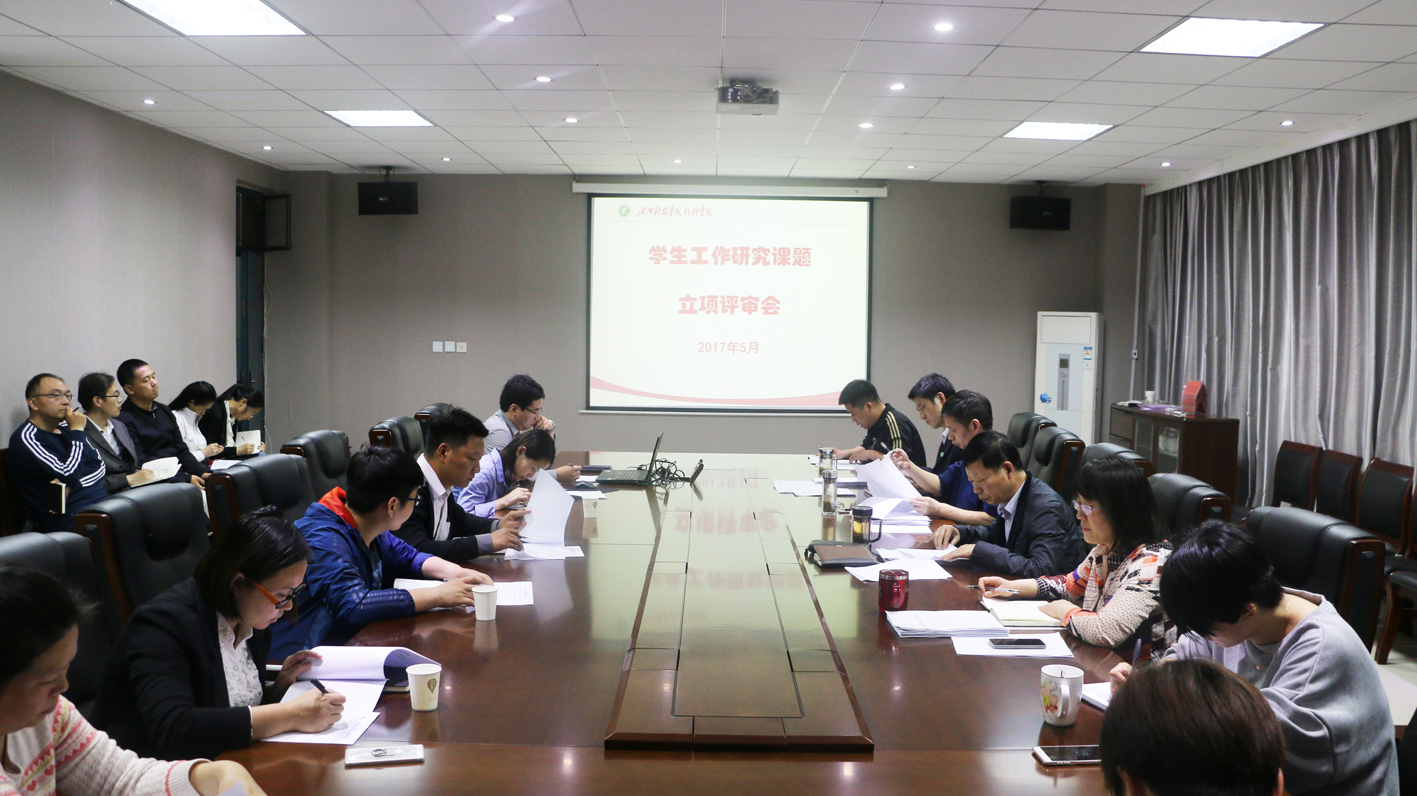 5月2日下午,我院2017年学生工作研究课题立项评审会在12号教学楼第二会议室举行。我院副院长张传来、张宝剑、姚素梅,党委副书记熊仁杰以及纪检监察室、学工部、科研部等部门负责人作为评委参加了会议。会议由学工部主任程海军主持。