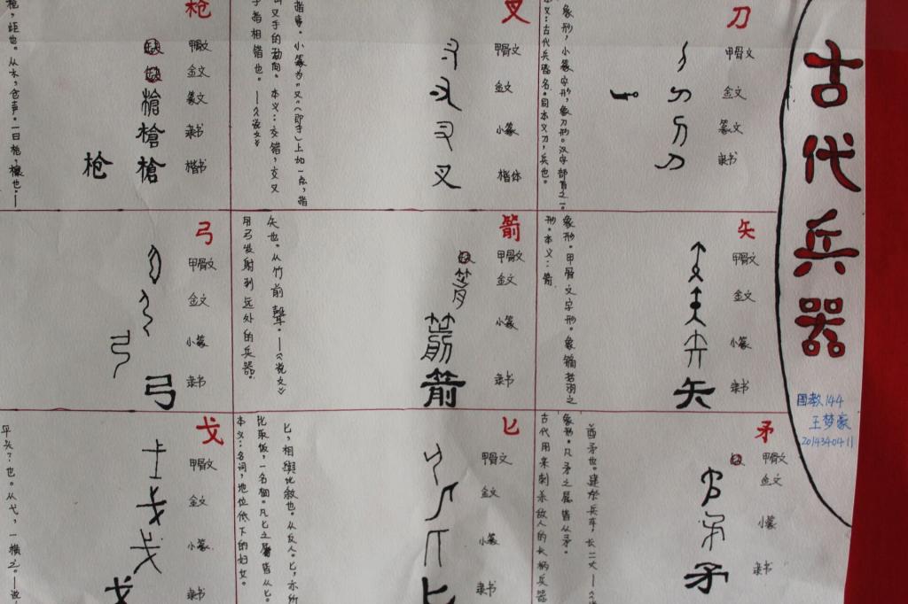 现场展示的2014级近百名学生实践周的活动成果,包括“汉字与兵器”、“汉字与人体”、“汉字与动物”、“汉字与姓氏”、“汉字与自然”、“汉字与饮食”等六个部分。同学们构图巧妙,内容独特,运用不同的手绘风格展现汉字的演变过程。观看展览后,刘鸣韬院长表示对同学们作品成果感到欣慰,这次展览非常有意义,希望作品要长久保留下来,他提出了一些宝贵的建议,要寻找具有新科特色的教学方式,不能照搬教学模式,要结合传统文化,结合我们对职业素养、文化素养的要求,突出了中文系特色。