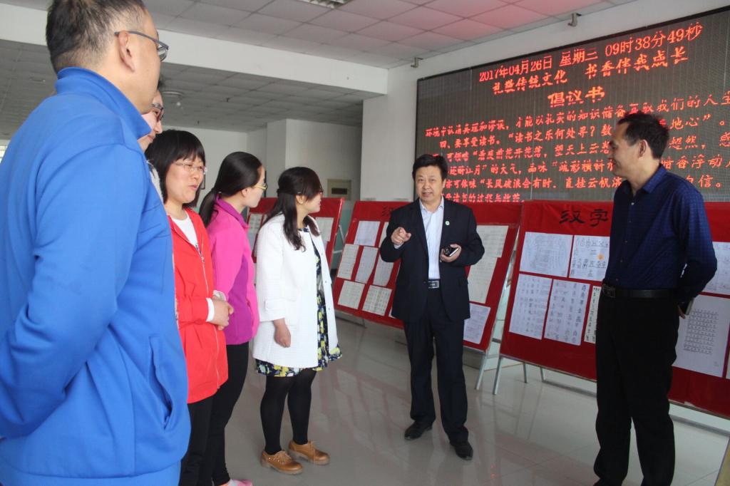 为展示中文系《汉字与中国文化》课程“中国文化辑录”实践周活动成果,提高同学们对汉字与中国文化的认识,4月26日,中文系在12号教学楼大厅展出2014级实践周活动成果。我院院长刘鸣韬,党委书记张忠迪,副院长姚素梅在中文系主任周淑贞、副主任蒋彬、教学秘书罗艳娟、2014级辅导员高敏的陪同下,观看了本次作品展览。
