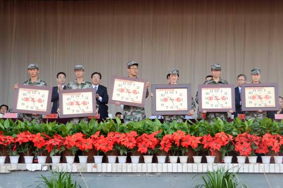 副校长杨松璋宣布了军训先进单位的获奖名单。我院获得队列训练第二名,在热烈掌声中,获奖单位上台领奖。