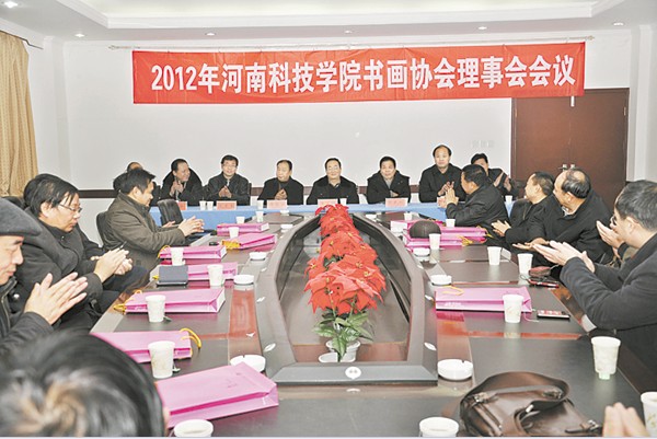 12月28日下午,河南科技学院书画协会在学术交流中心三楼会议室召开“2012年书画协会理事大会”。副校长王文鹏,原正校级调研员、书画协会名誉主席张民校出席会议。辉县市人大常委会秘书长、书法家协会副主席穆学斌应邀出席会议。书画协会主席吴国梁,书画协会常务副主席尤太生,书画协会副主席梅宪宾、李新、姚刚、张新词,书画协会理事项继堂、游春山、卫全民、王运兵、于桢、乔有职、旦勇刚、焦涛、刘刚、刑孟志等40余人参加了会议。会议由书画协会常务副主席尤太生主持。