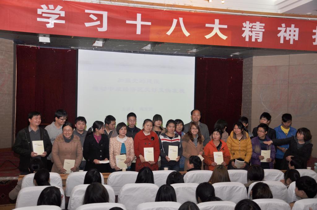 梅院长随后讲到,认真学习十八大报告,就是要深刻把握党的建设的新思想、新论断、新要求,认清党的建设面临的“四大考验、四大危险、两大课题”的新形势,牢牢把握新时期党建“一条主线、‘三型’目标、四项原则、五个布局、八项任务”的总体要求,结合河南实际,深入学习十八大报告关于全面提高党的建设科学化水平的有关论述。梅院长从中原经济区的概念及范围、战略定位、发展目标、空间布局等几方面详细介绍了中原经济区整体概况。实现“三化”协调科学发展,推动中原经济区又好又快发展,必须注意处理好中原经济区城镇化战略问题、土地利用问题、户籍改革问题、融城问题、产业支撑问题、生态环境问题等,只有如此,才能建设好中原经济区,才能把提高党的建设科学化水平落到实处。结合中原经济区建设的实际,必须要加强党的建设,提高党领导科学发展的能力,为中原经济区建设提供坚强的组织保证,为中原经济区建设保驾护航。